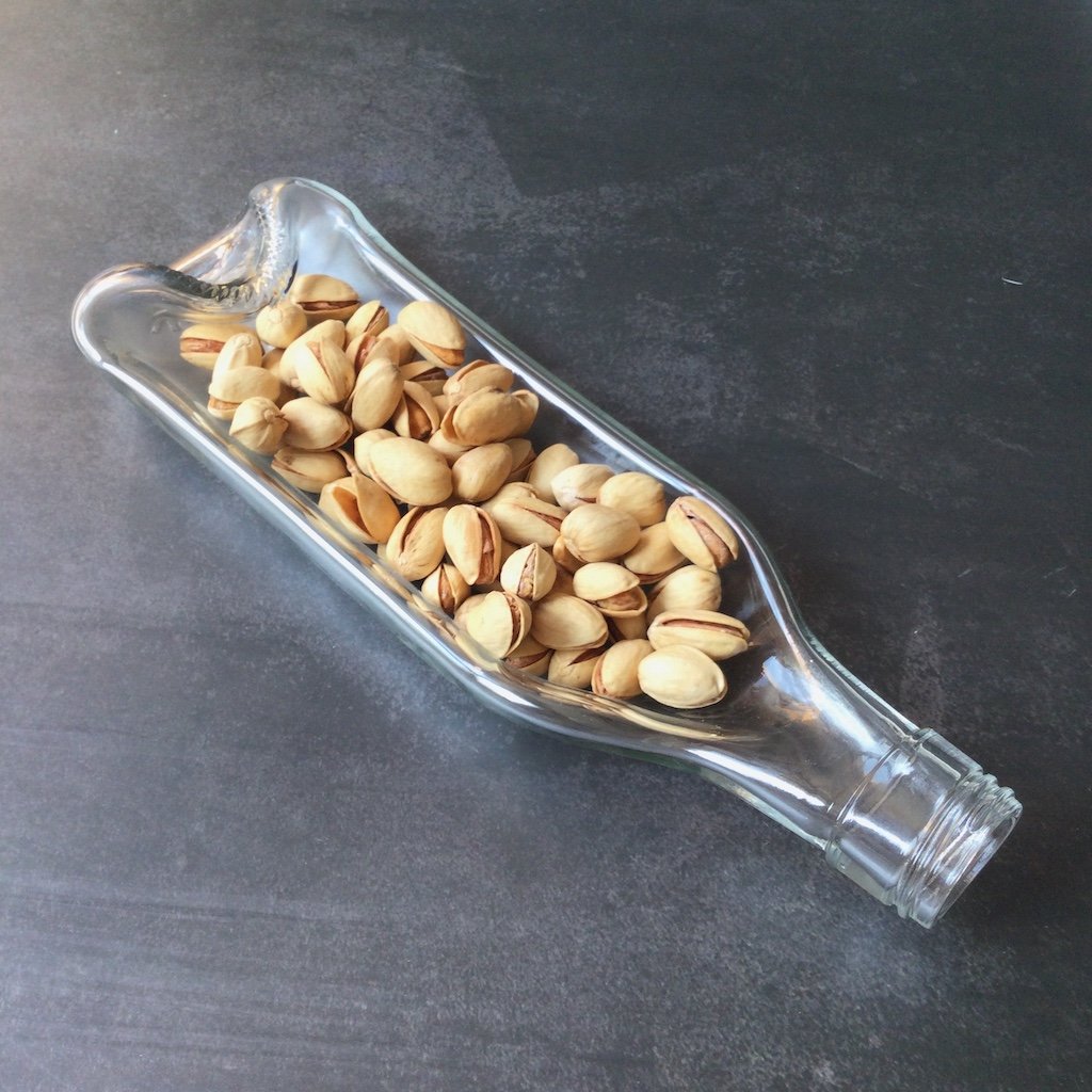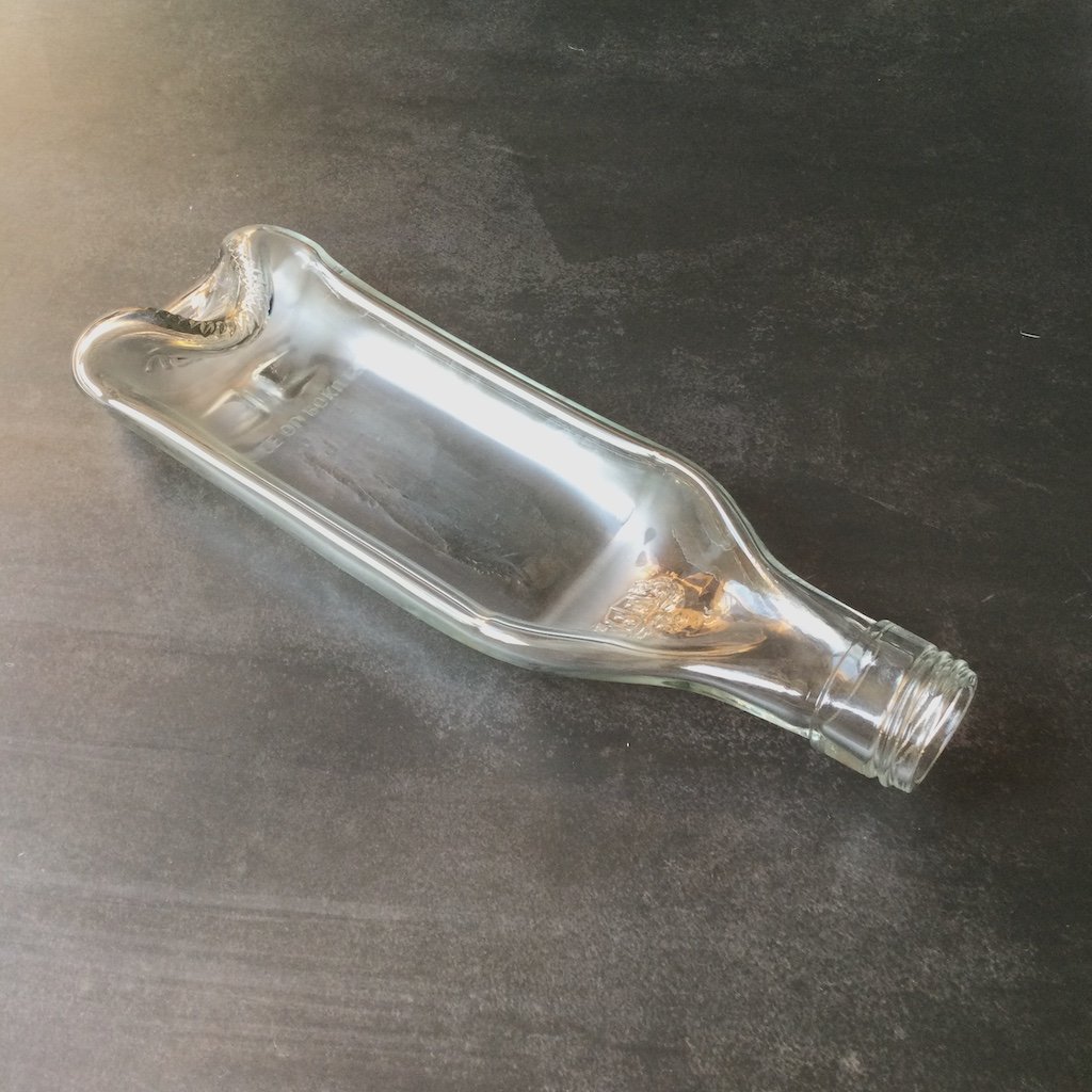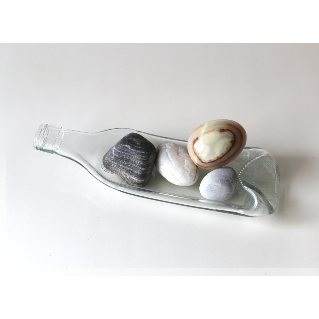 Upcyklovaná miska na různé delikatesy, nebo na svíčky či jiné drobnosti je vyrobena z láhve od malého rumu, kde zůstalo krásně vidět logo značky. Svůj tvar získala díky svému pobytu v peci, kde se teplota vyšplhala až na 800 stupňů Celsia.