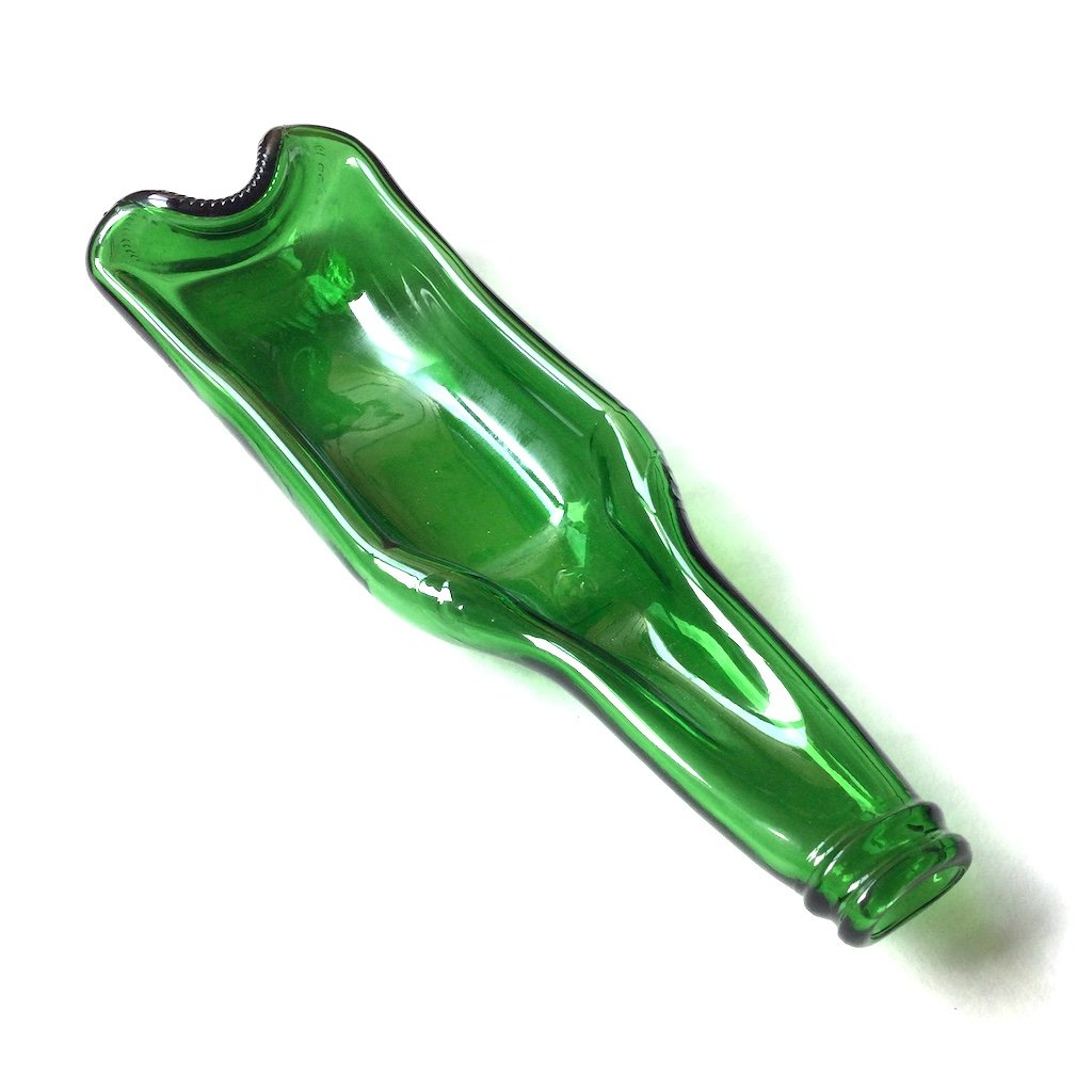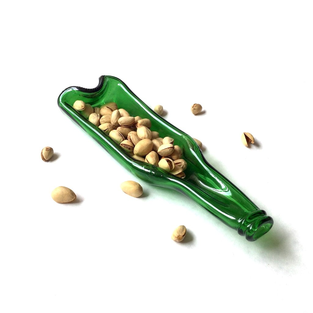 Upcyklovaná miska na různé delikatesy či jiné drobnosti (případně vhodná i jako popelník) je vyrobena z klasické pivní láhve zelené barvy. U hrdla je vidět detail značky Budvar. Svůj tvar získala díky svému pobytu v peci, kde se teplota vyšplhala až na 800 stupňů Celsia.