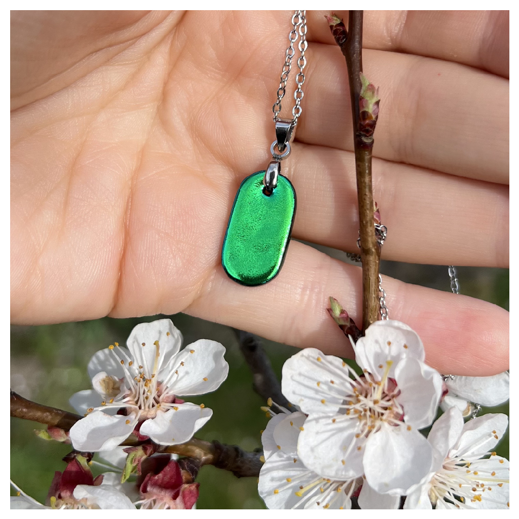 Náhrdelník Constantina Viridis pracuje s protáhlou formou a proměnlivostí dichroického skla. Podlouhlý tvar působí čistě a vyváženě, zatímco zelené sklo zachycuje světlo a mění se podle pohybu i úhlu pohledu.