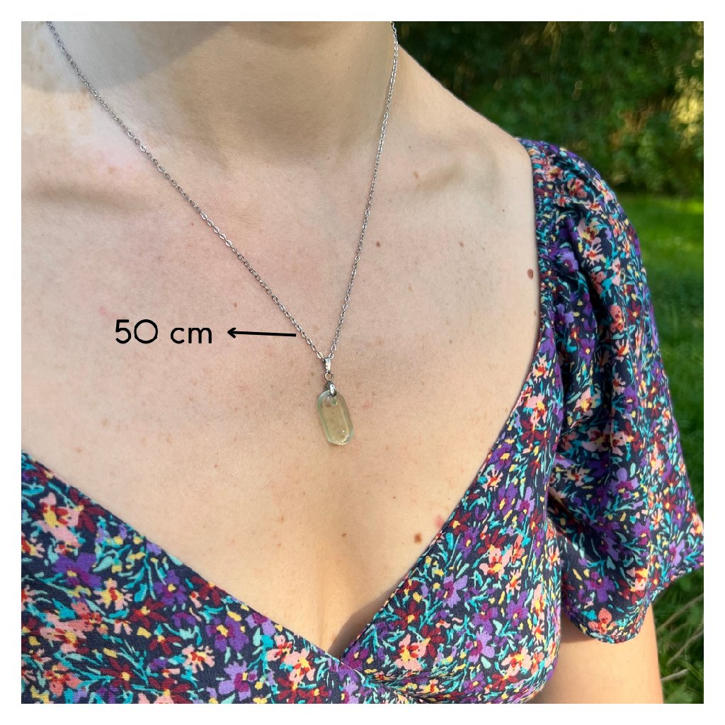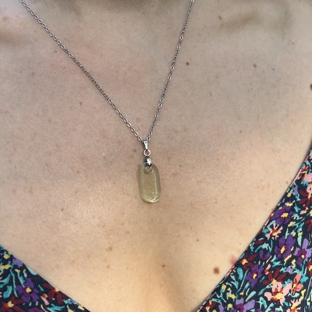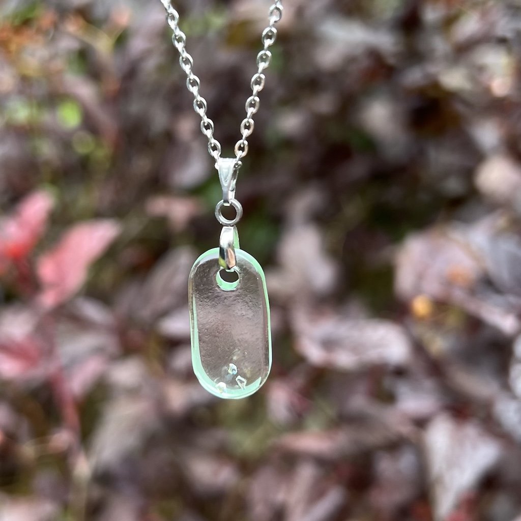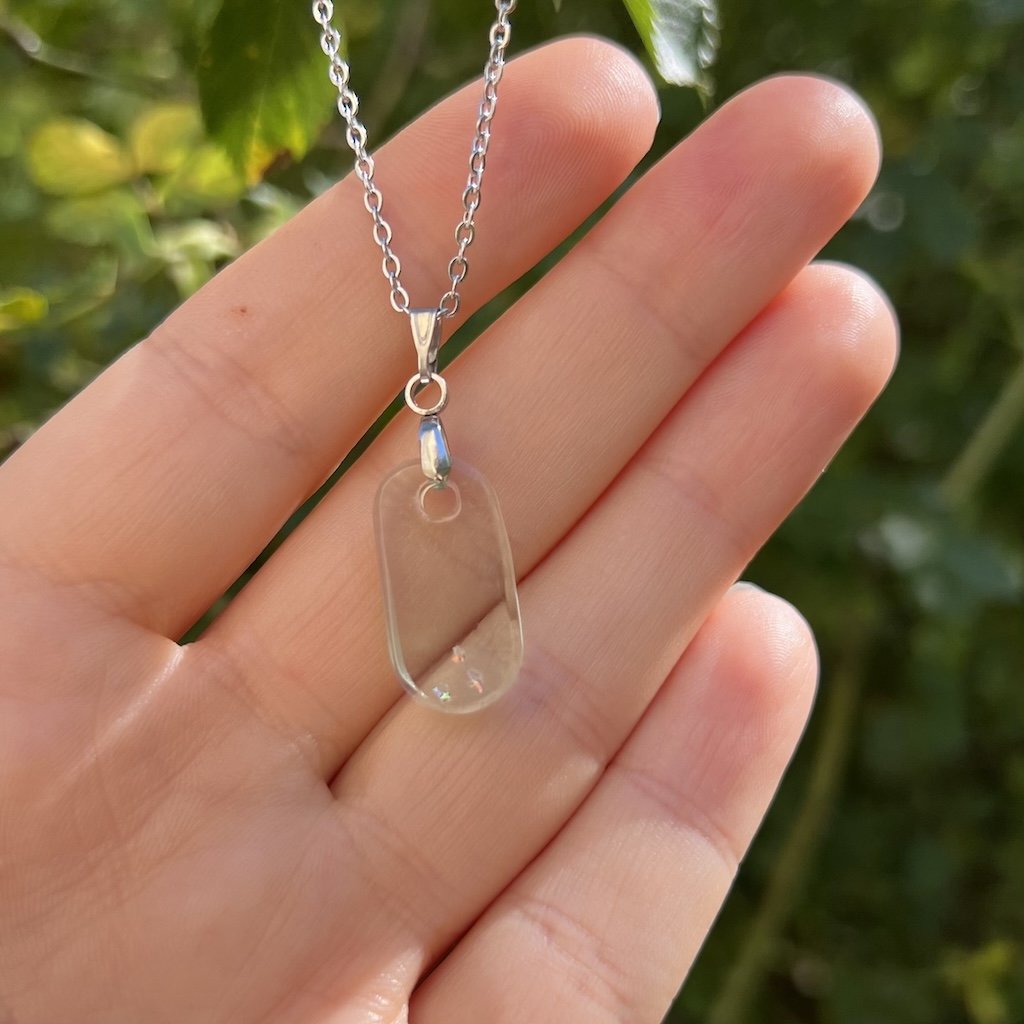 Oválek je vyroben ze skla, lépe řečeno ze skla od láhve ginu a je zavěšen na řetízku, který je z chirurgické oceli.