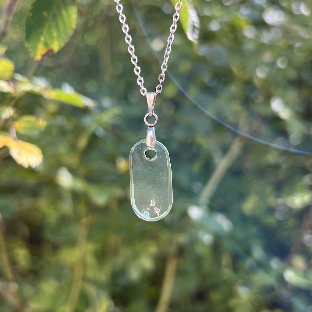 Zajímavý náhrdelní pro běžné nošení i slavnostní příležitost. Náhrdelník je vyroben ze skla od láhve britského ginu Plymouth a ozdoben je kousky tzv. dichroického skla, které hází krásné odlesky.