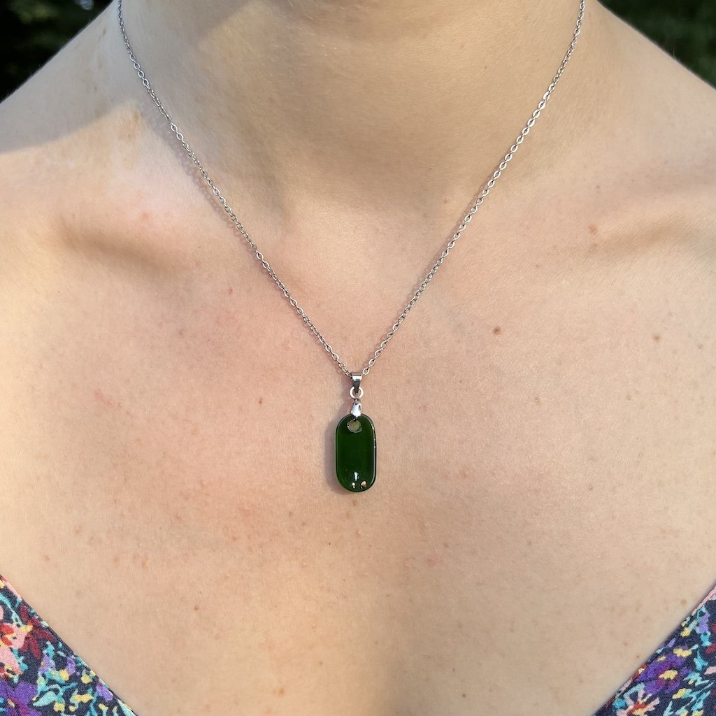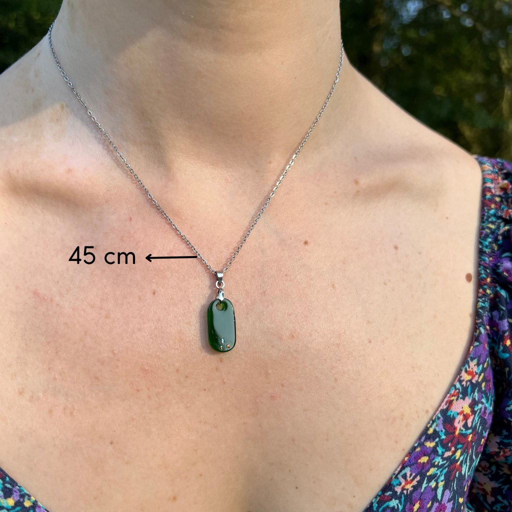 Oválek je vyrobena ze skla, lépe řečeno ze skla od láhve vína a je zavěšen na řetízku, který je z chirurgické oceli.