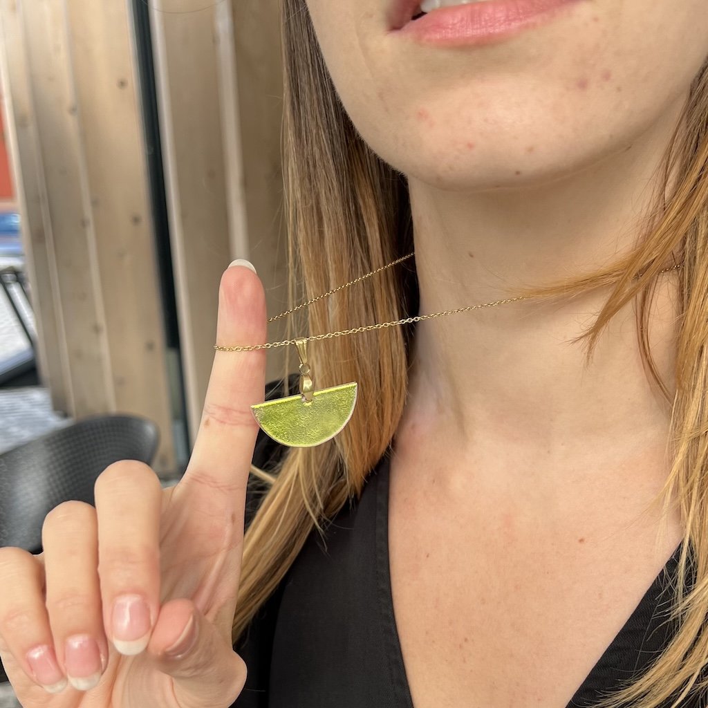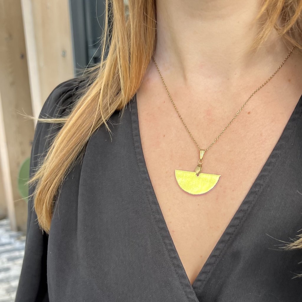 Zajímavý náhrdelník pro běžné nošení i slavnostní příležitost. Náhrdelník je vyroben z tzv. dichroického skla, které je velmi blyštivé. Jeho jedinečností je také to, že mění barvu v závislosti na úhlu pohledu a zdroji světla. Tento jedinečný efekt mu dodává luxusní a futuristický vzhled. Tyto náušnice jsou mají odstíny zlaté s přechody do fialové až růžové.