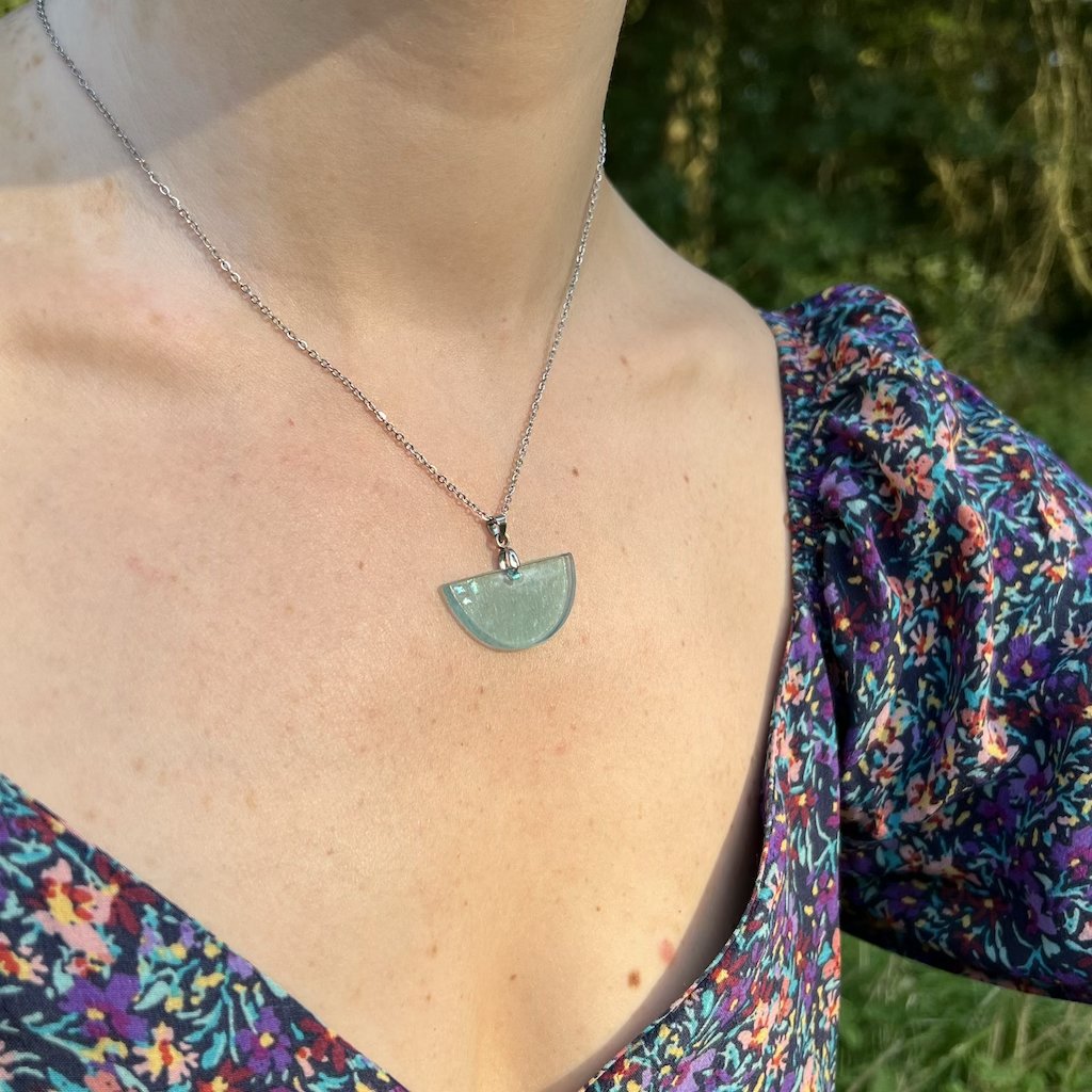 Zajímavý náhrdelník pro běžné nošení i slavnostní příležitost. Náhrdelník je vyroben ze skla od láhve nejpopulárnějšího ginu Bombay Sapphire a ozdoben je dichroickým sklem, které hází odlesky.