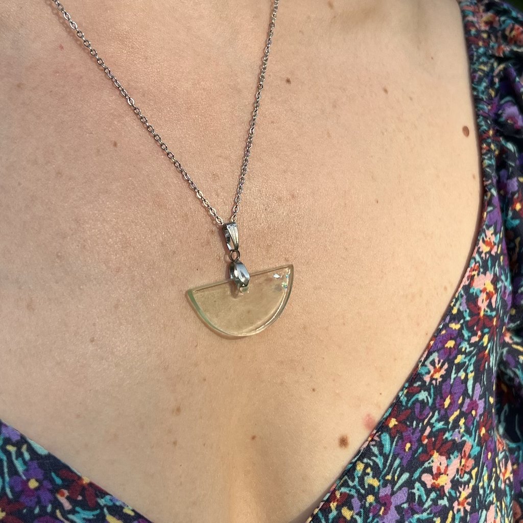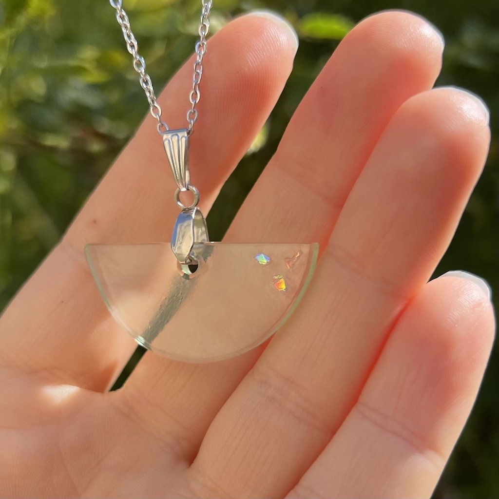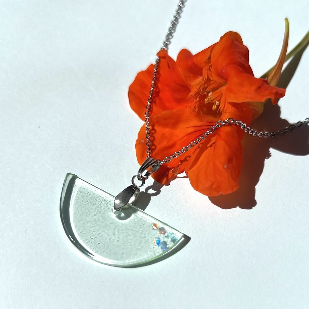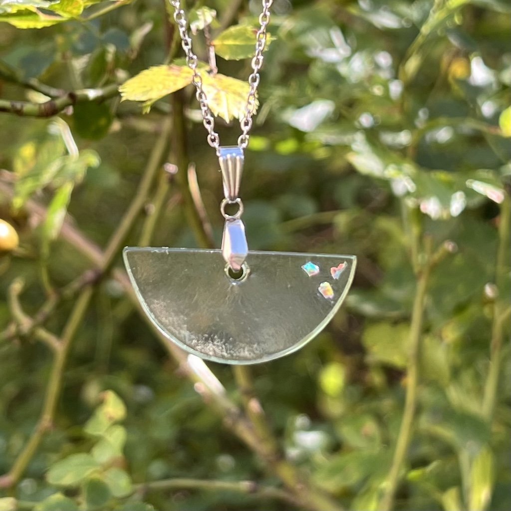 Zajímavý náhrdelník pro běžné nošení i slavnostní příležitost. Náhrdelník je vyroben ze skla od láhve zelenkavé barvy britského ginu Bombay Sapphire a ozdoben je dichroickým sklem, které hází odlesky.