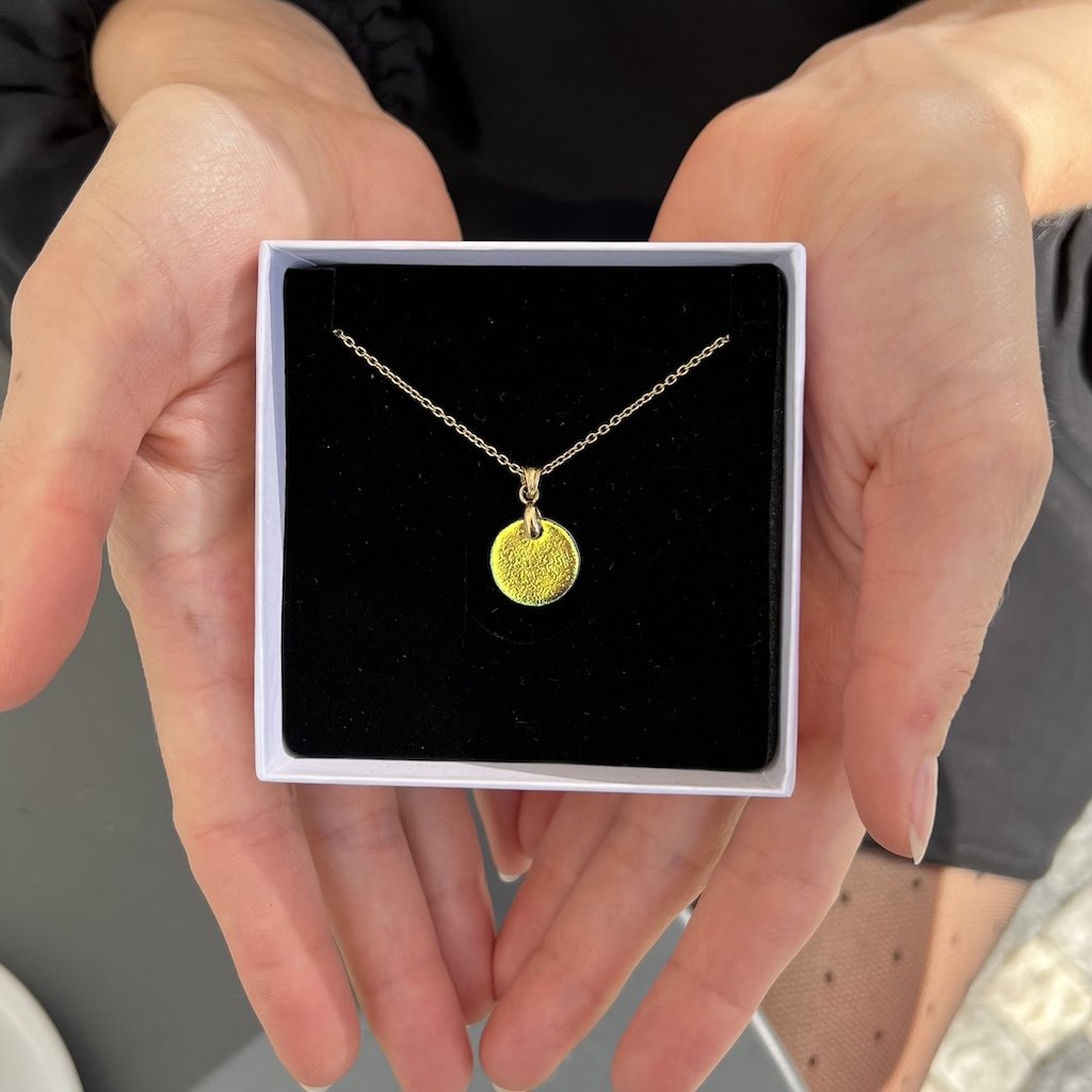 Zajímavý náhrdelník pro běžné nošení i slavnostní příležitost. Náhrdelník je vyroben z tzv. dichroického skla, které je velmi blyštivé. Jeho jedinečností je také to, že mění barvu v závislosti na úhlu pohledu a zdroji světla. Tento jedinečný efekt mu dodává luxusní a futuristický vzhled. Tyto náušnice jsou mají odstíny zlaté s přechody do fialové až růžové.