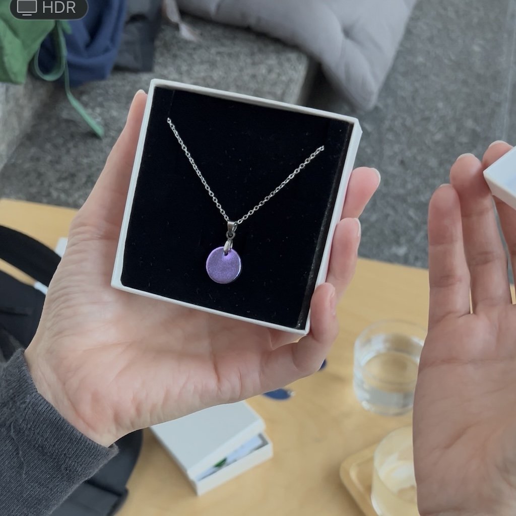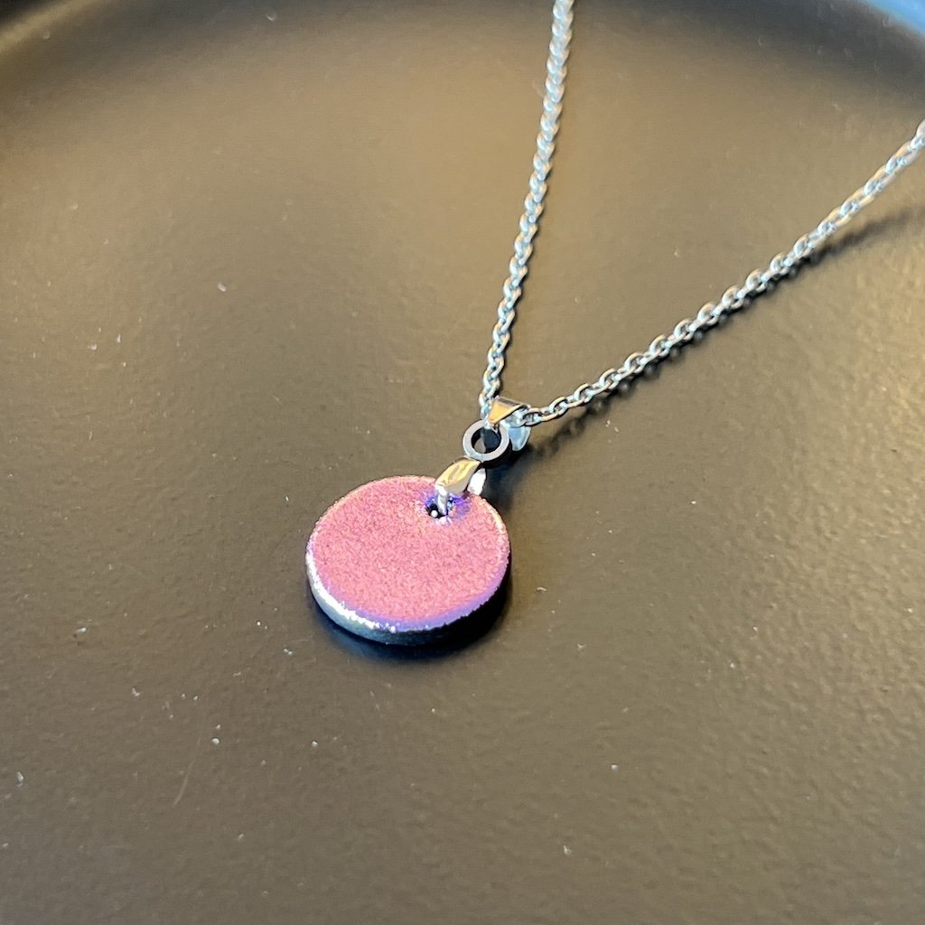 Zajímavý náhrdelník pro běžné nošení i slavnostní příležitost. Náhrdelník je vyroben z tzv. dichroického skla, které je velmi blyštivé. Jeho jedinečností je také to, že mění barvu v závislosti na úhlu pohledu a zdroji světla. Tento jedinečný efekt mu dodává luxusní a futuristický vzhled. Tento náhrdelník má odstíny tmavě růžové až fialové s lehkým nádechem modré.