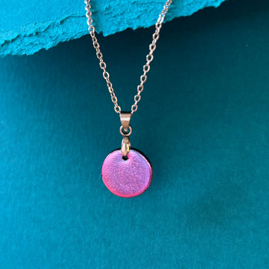 Kulatý přívěsek z růžovo-fialového dichroického skla zachycuje světlo v jemných, proměnlivých odlescích. Barva se mění podle pohybu a úhlu pohledu.