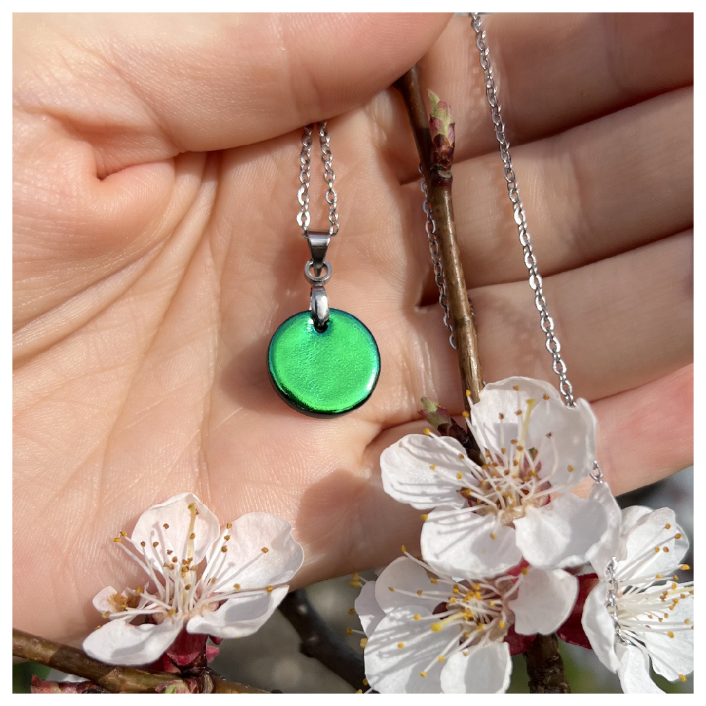 Náhrdelník Eufrozina mini Viridis stojí na jednoduchosti tvaru a síle materiálu. Malý kulatý prvek z dichroického skla zachycuje světlo a mění se s každým pohybem.