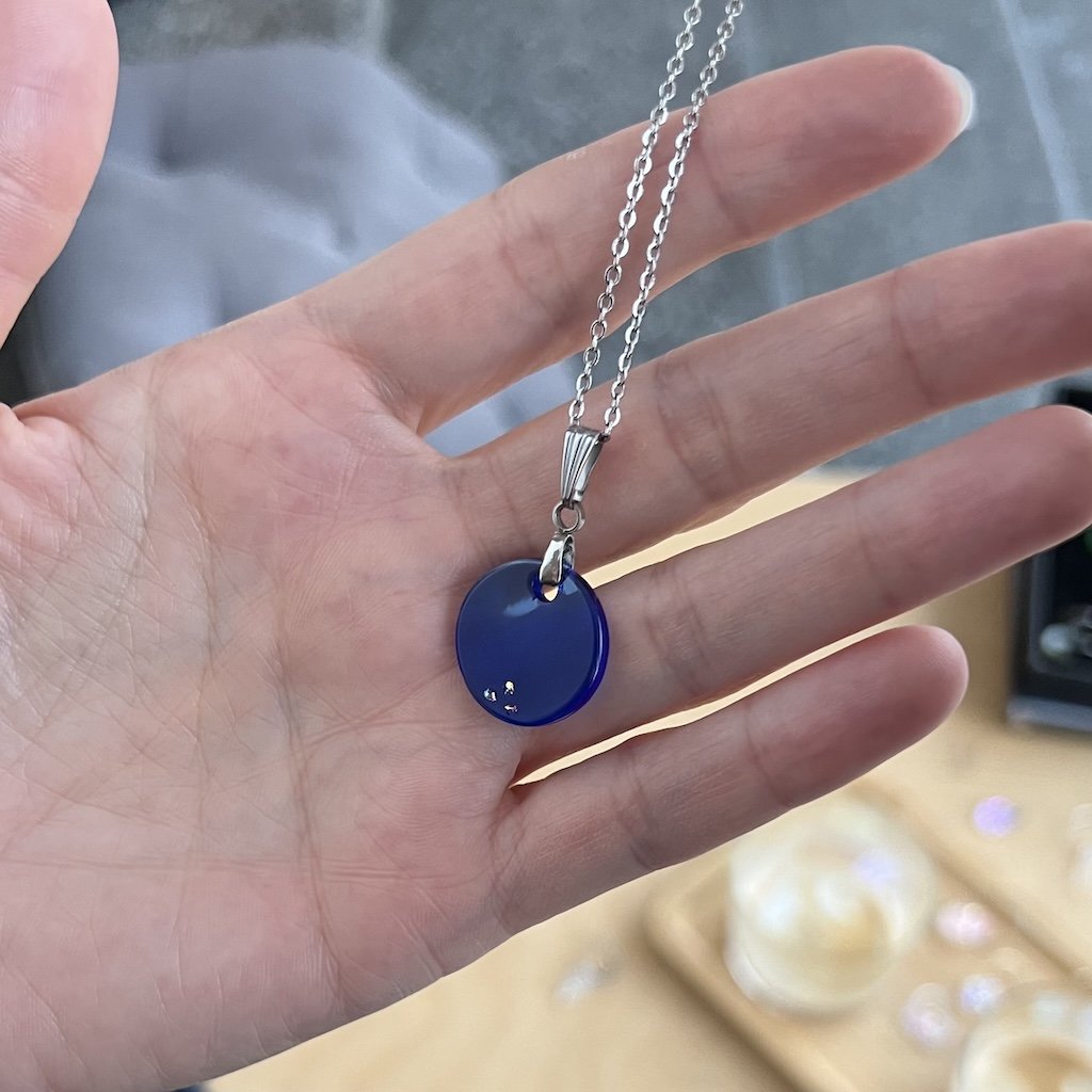 Kolečko je vyrobena ze skla, lépe řečeno ze skla od láhve vína a je zavěšen na řetízku, který je z chirurgické oceli.