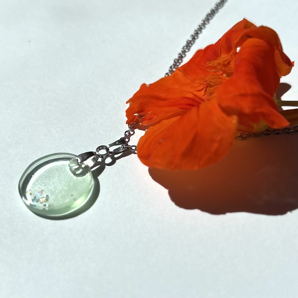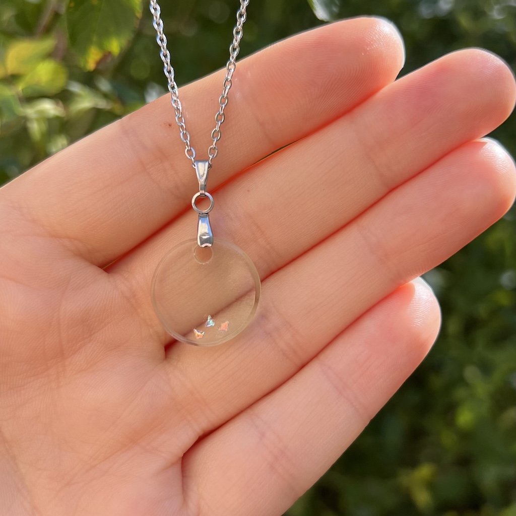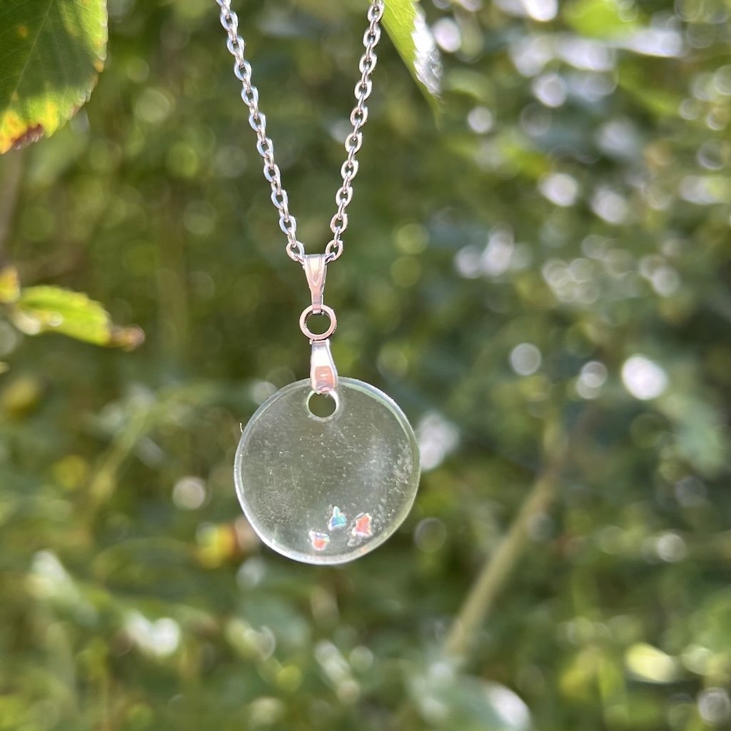 Kolečko je vyrobena ze skla, lépe řečeno ze skla od láhve ginu a je zavěšeno na řetízku, který je z chirurgické oceli.