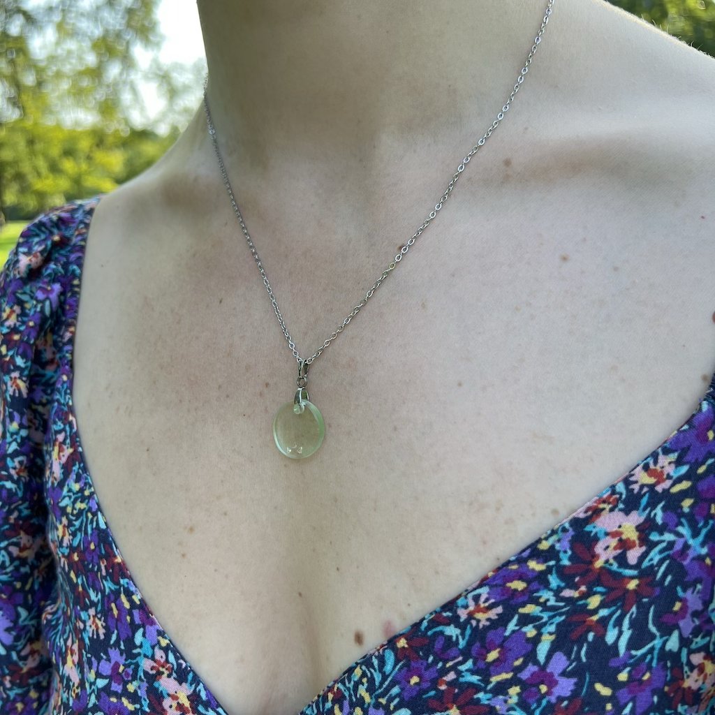 Zajímavý náhrdelník zelenkavé barvy pro běžné nošení i slavnostní příležitost. Náhrdelník je vyroben ze skla od láhve britského ginu Plymouth a ozdoben je kousky tzv. dichroického skla, které hází krásné odlesky.