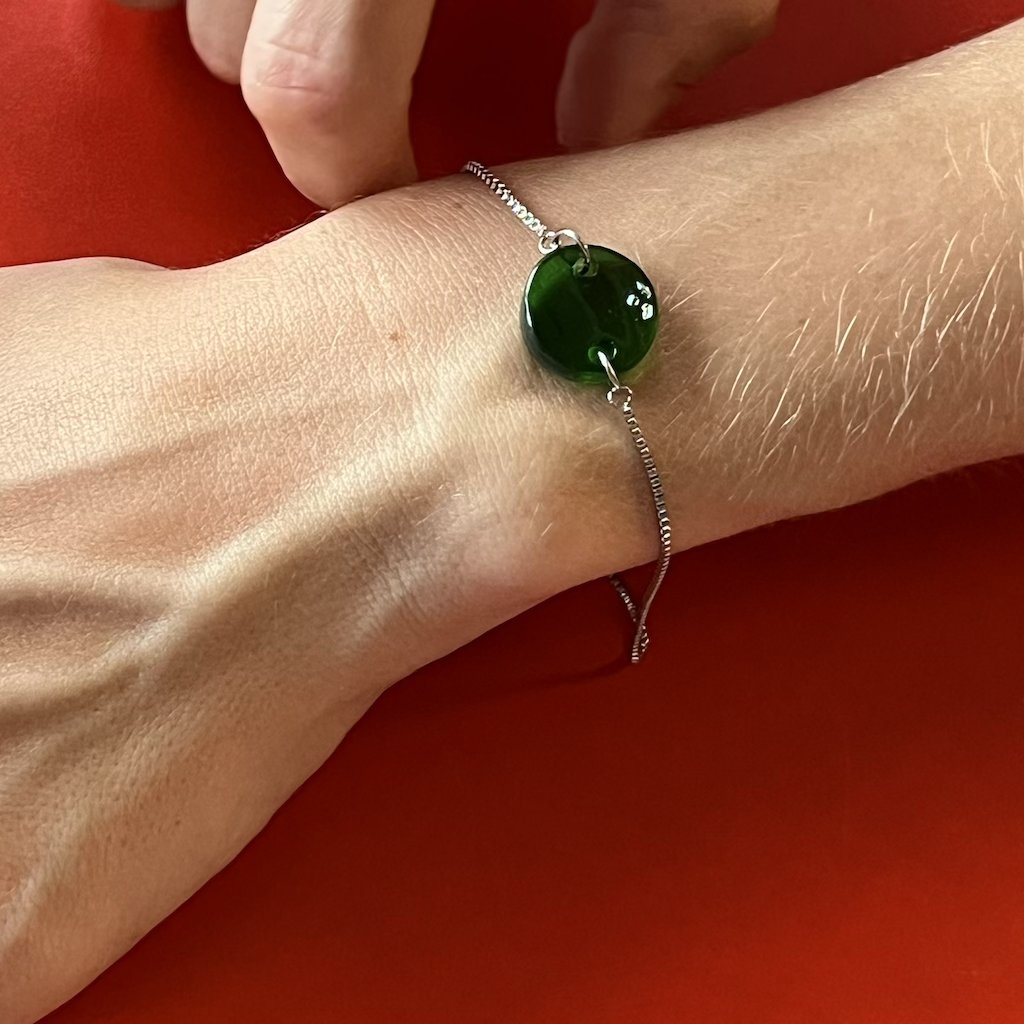 Kolečko je vyroben ze skla, lépe řečeno z ze skla od Bohemia Sektu a je na posuvném náramku z chirurgické oceli.