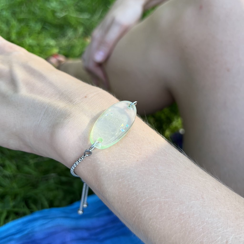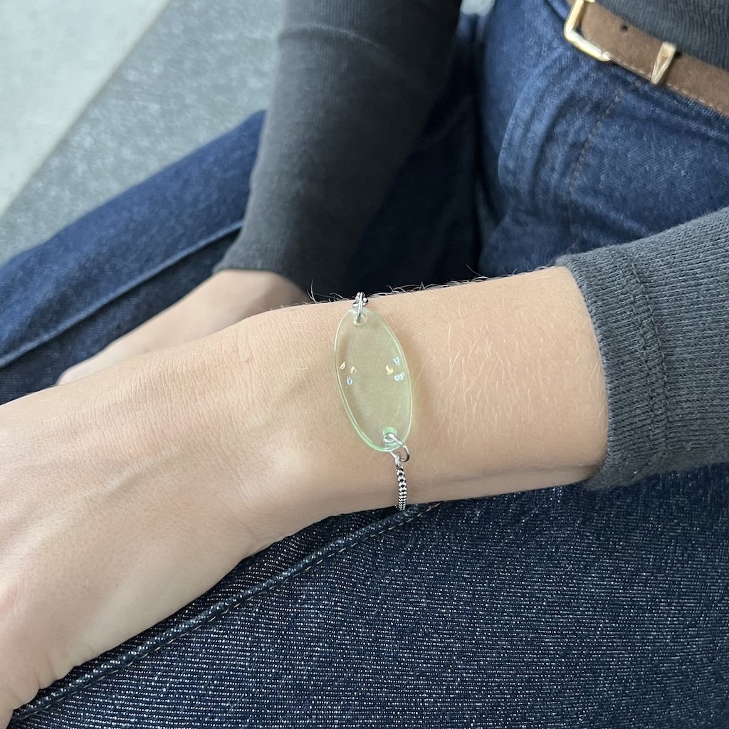 Ovál je vyroben ze skla, lépe řečeno z ze skla láhve a je na posuvném náramku z chirurgické oceli.