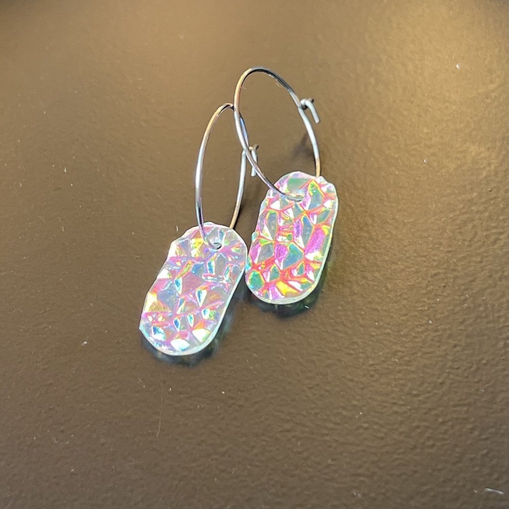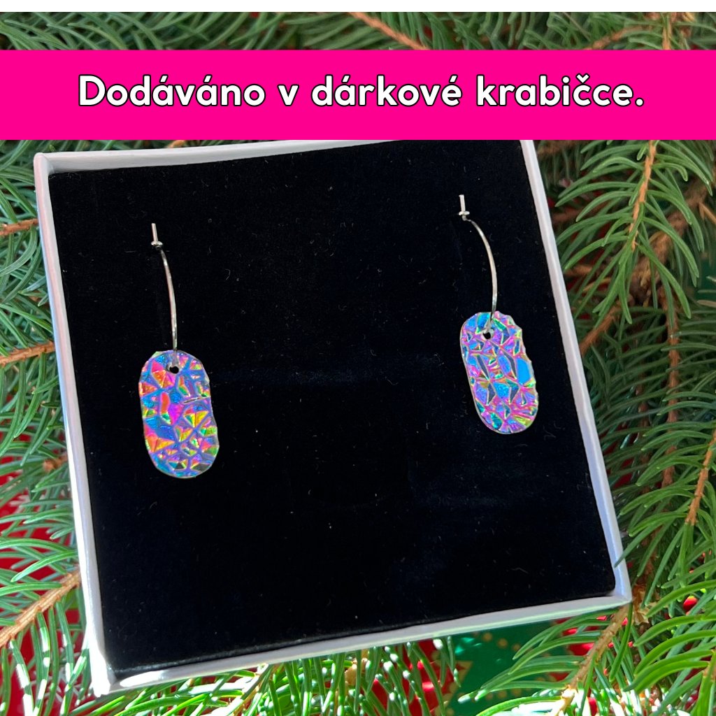 Elegantní menší náušnice jsou vyrobeny z tzv. dichroického skla, které je velmi blyštivé. Jeho jedinečností je také to, že mění barvu v závislosti na úhlu pohledu a zdroji světla. Tento jedinečný efekt mu dodává luxusní a futuristický vzhled. Tyto náušnice jsou mají odstíny všech barev.