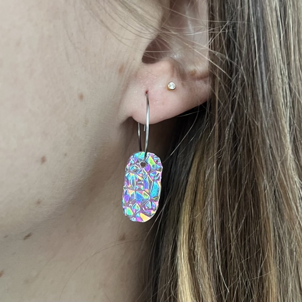 Tvar oválku je zavěšen na kroužku z chirurgické oceli. Tento typ zapínaní je super praktický, zvláště v zimním počasí, kdy nosíme šály, jelikož vám drží krásně na svém místě a nehrozí ztracení náušnice.