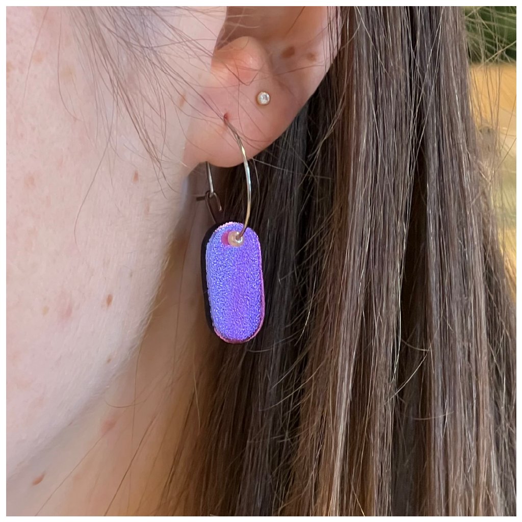 Geometrický tvar dává třpytivé hře růžových a fialových tónů dichroického skla pevný rámec. Světlo se na povrchu láme jinak než u kulatých forem. Přesněji, strukturovaně, s jasným rytmem. Skleněný prvek je jemně doplněn drobným korálkem, který dodává šperku další detail a vizuální rovnováhu.