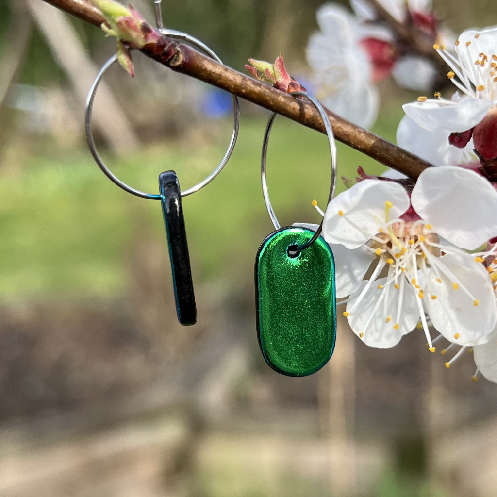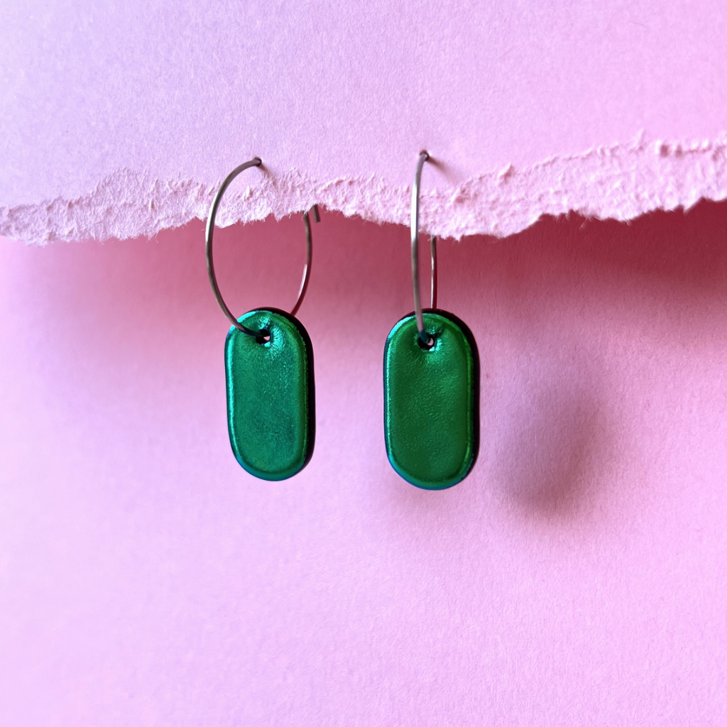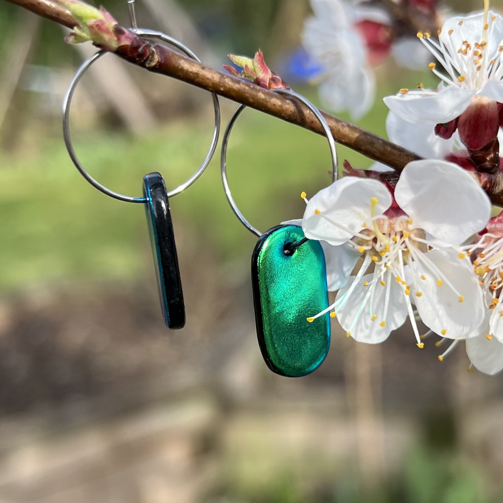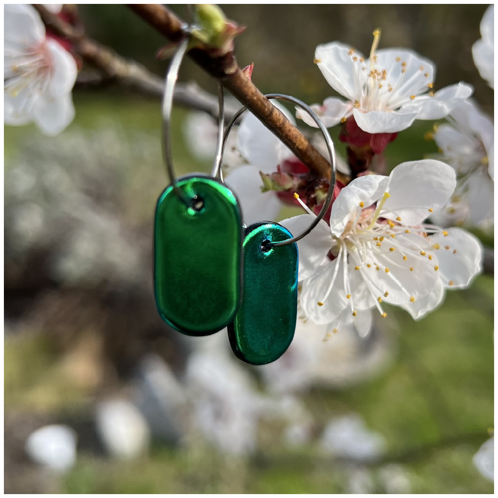 Podlouhlý tvar dává zelenému dichroickému sklu pevný směr. Světlo se na povrchu láme jinak než u kulatých forem. Přesněji. Klidněji. S větší hloubkou.
