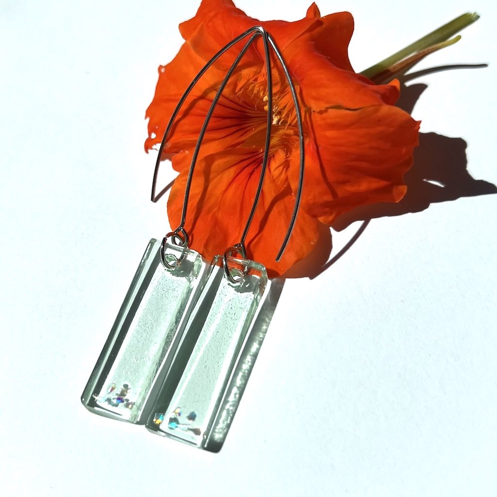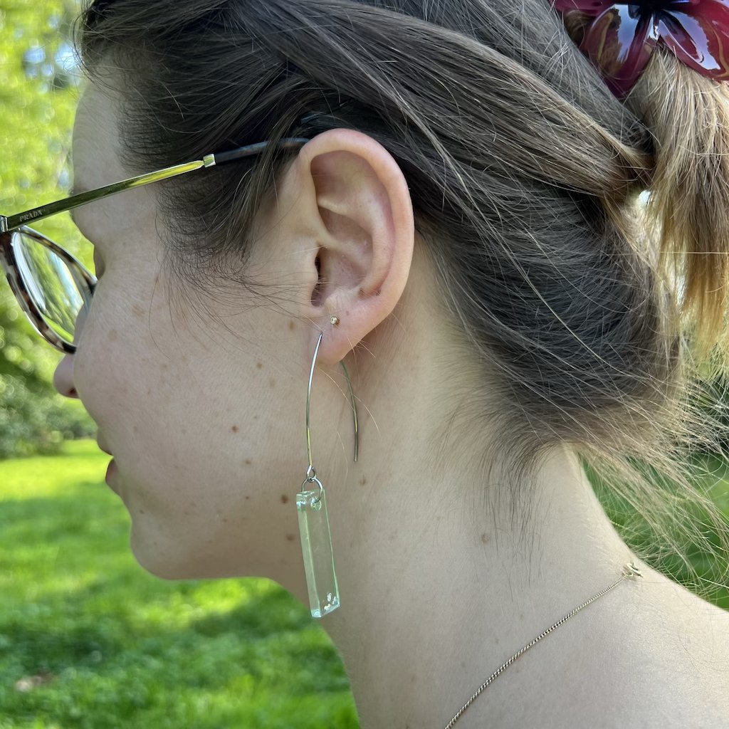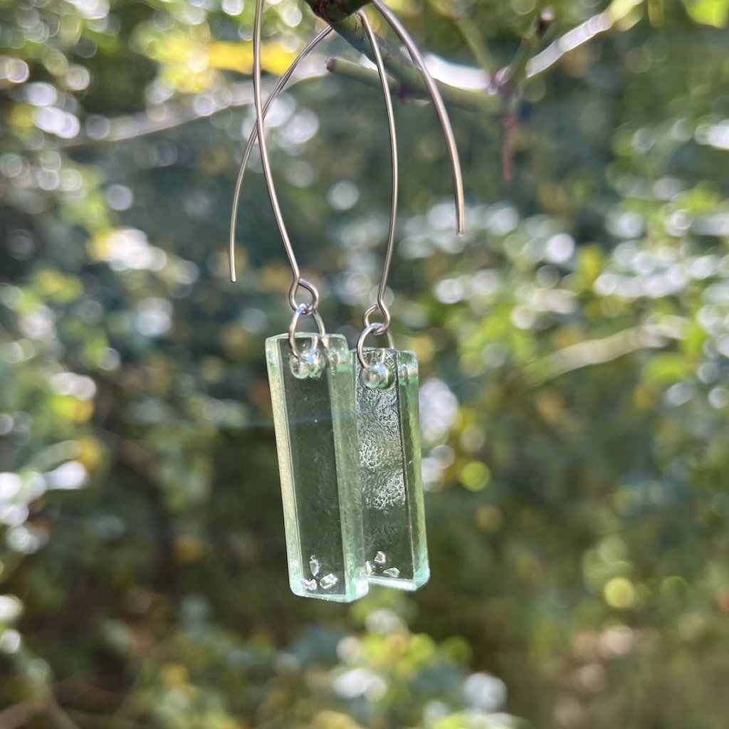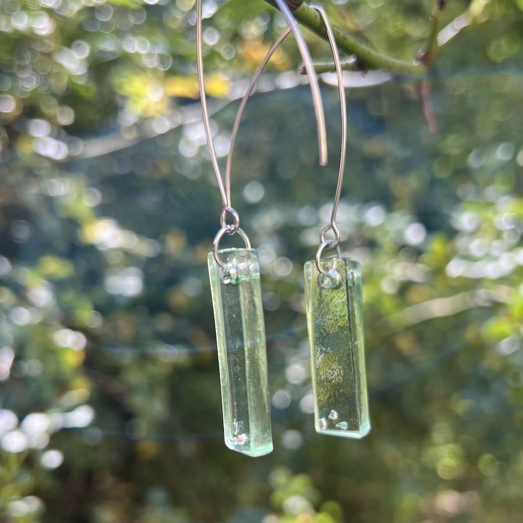 Tyto náušnice jsou ideální pro každodenní nošení i pro speciální příležitosti. Jejich zelenkavá barva přidává jiskru a originalitu k jakémukoliv outfitu, ať už jde o formální nebo neformální styl. Jsou vyrobeny ze skla od láhve britského ginu Plymouth a ozdobeny kousky dichroického skla, které je blyštivé a hází hezké odlesky.