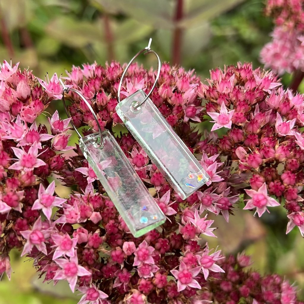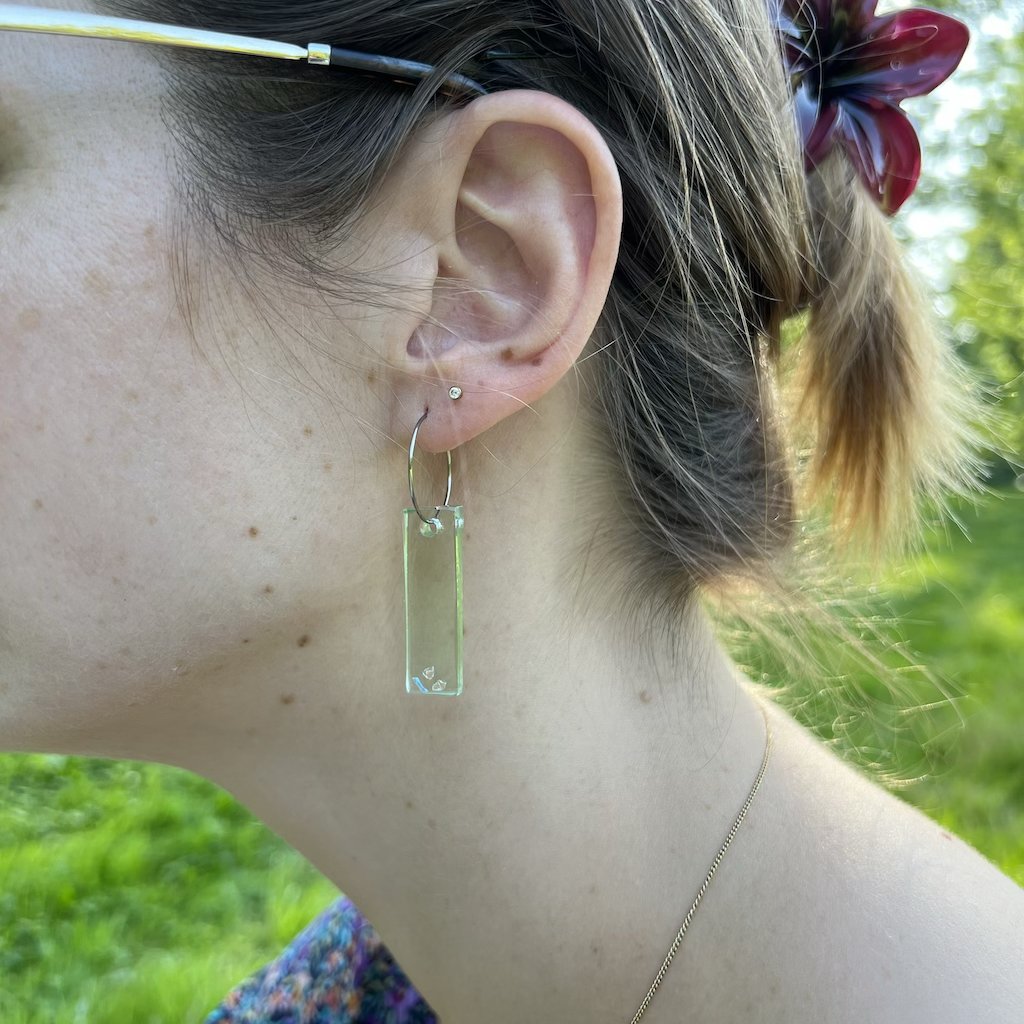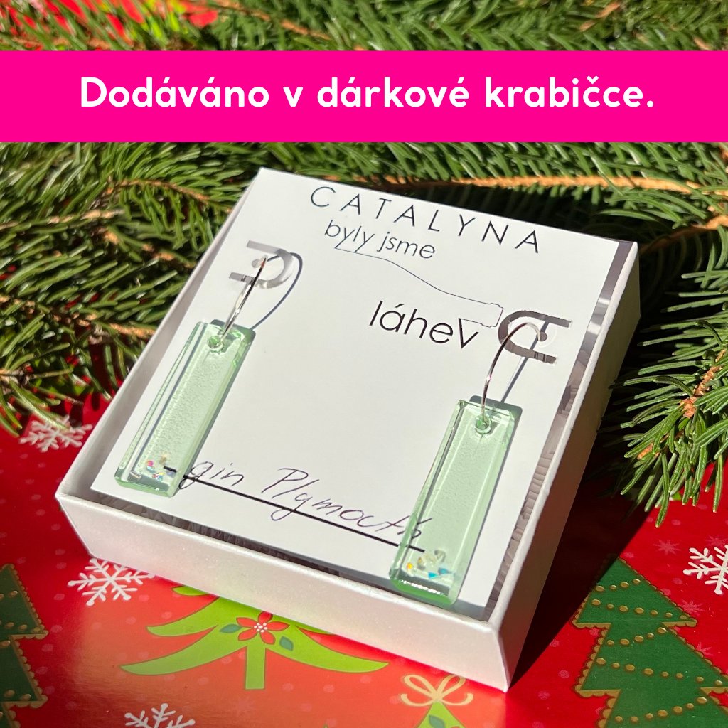 Náušnice Eirene z láhve od ginu Plymouth se třpytkami na kroužku