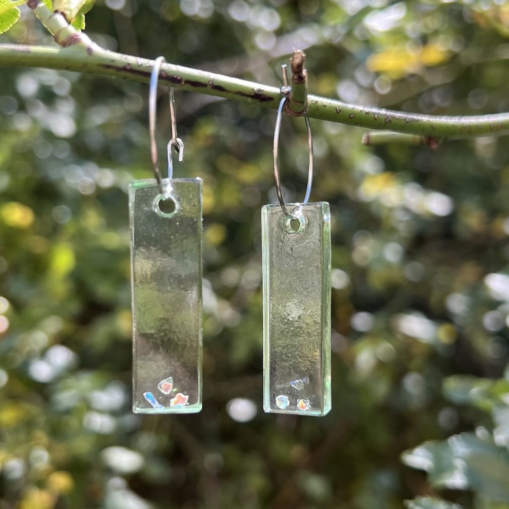 Elegantní náušnice jsou vyrobeny ze skla zelenkavé barvy láhve britského ginu Plymouth a dozdobeny dichroickým sklem, které hází krásné odlesky.