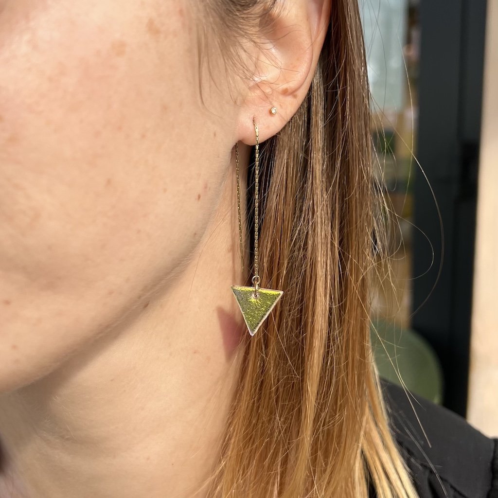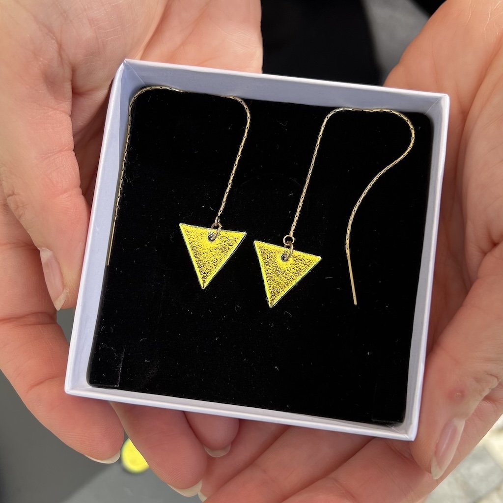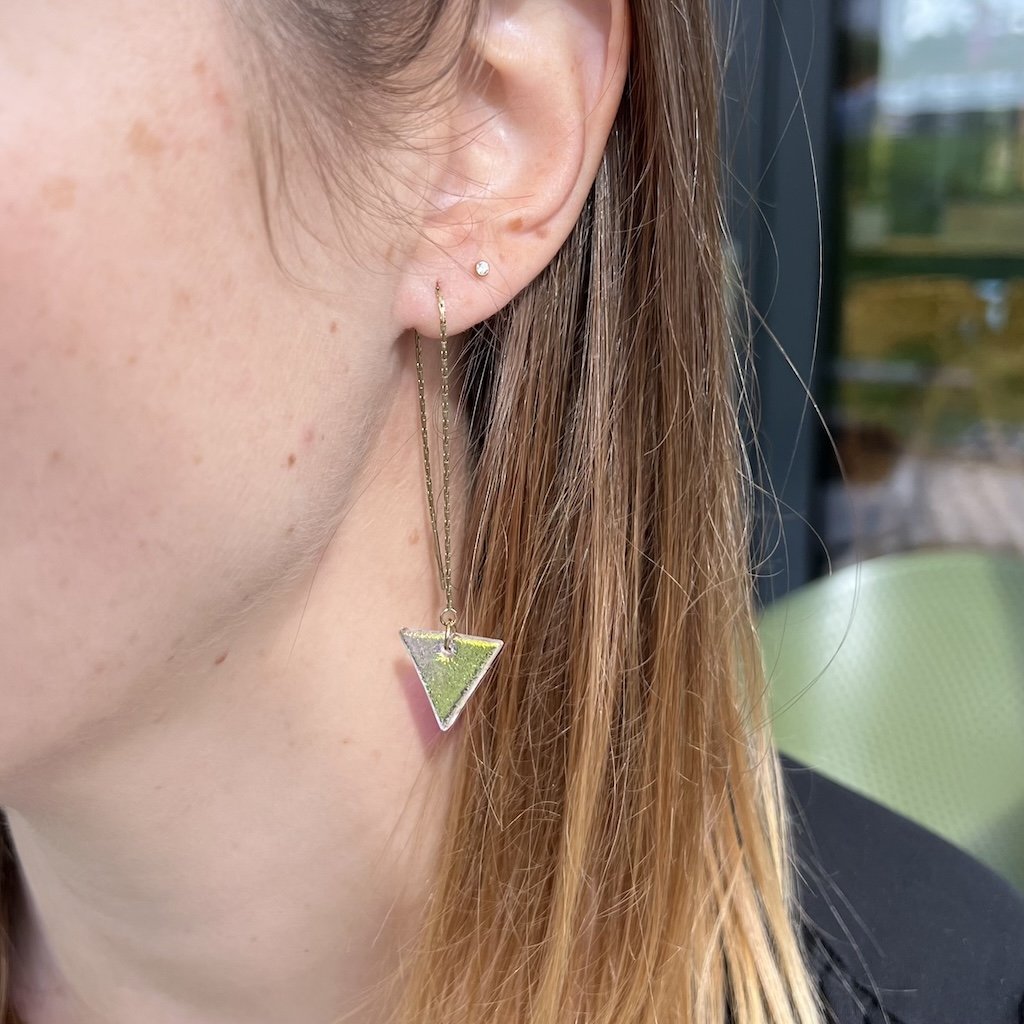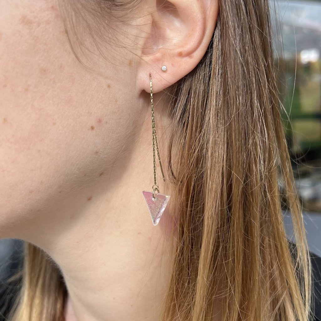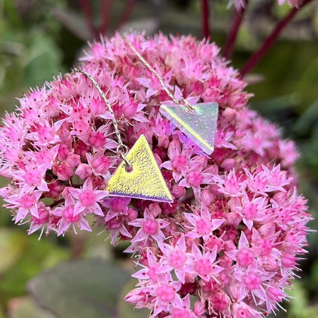 Elegantní menší náušnice jsou vyrobeny z tzv. dichroického skla, které je velmi blyštivé. Jeho jedinečností je také to, že mění barvu v závislosti na úhlu pohledu a zdroji světla. Tento jedinečný efekt mu dodává luxusní a futuristický vzhled. Tyto náušnice jsou mají odstíny zlaté s přechody do fialové až růžové.