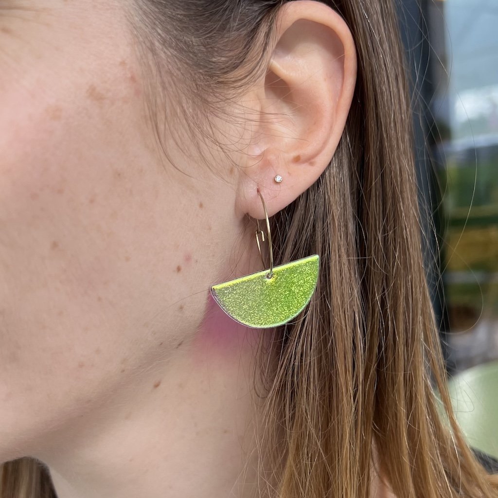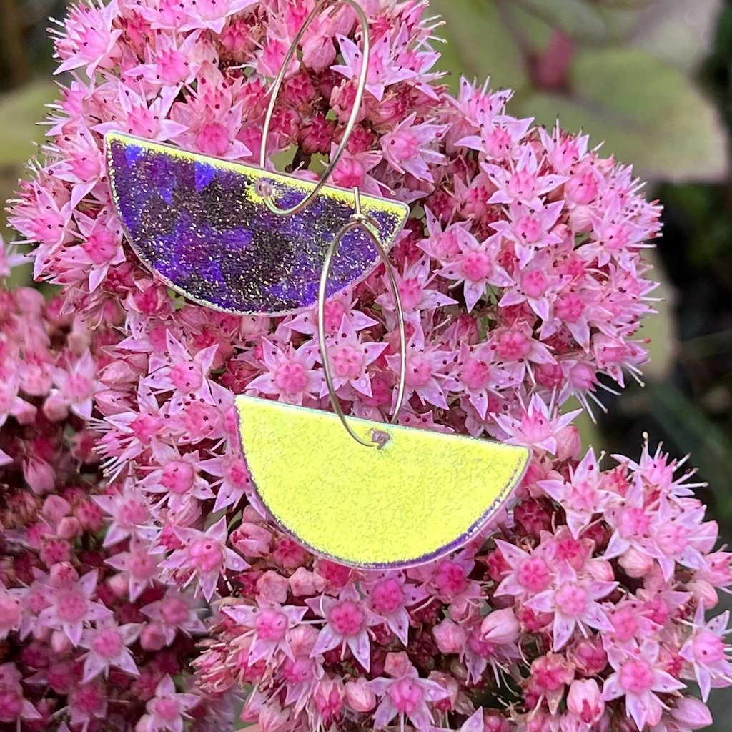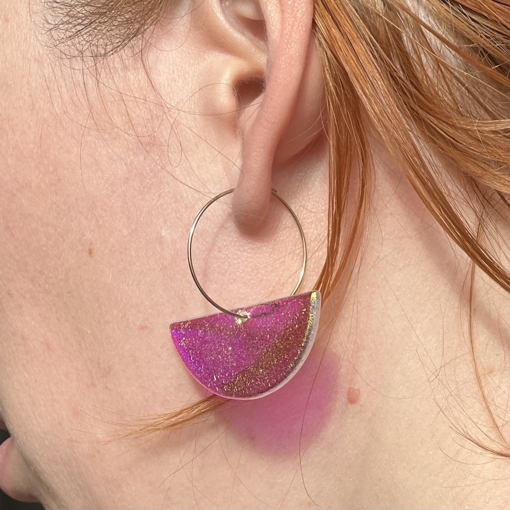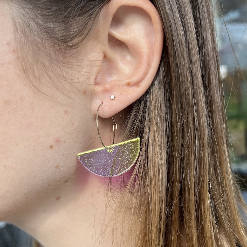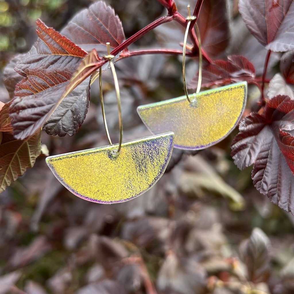 Neotřelé náušnice jsou vyrobeny z tzv. dichroického skla, které je velmi blyštivé. Jeho jedinečností je také to, že mění barvu v závislosti na úhlu pohledu a zdroji světla. Tento jedinečný efekt mu dodává luxusní a futuristický vzhled. Tyto náušnice jsou mají odstíny zlaté s přechody do fialové až růžové.