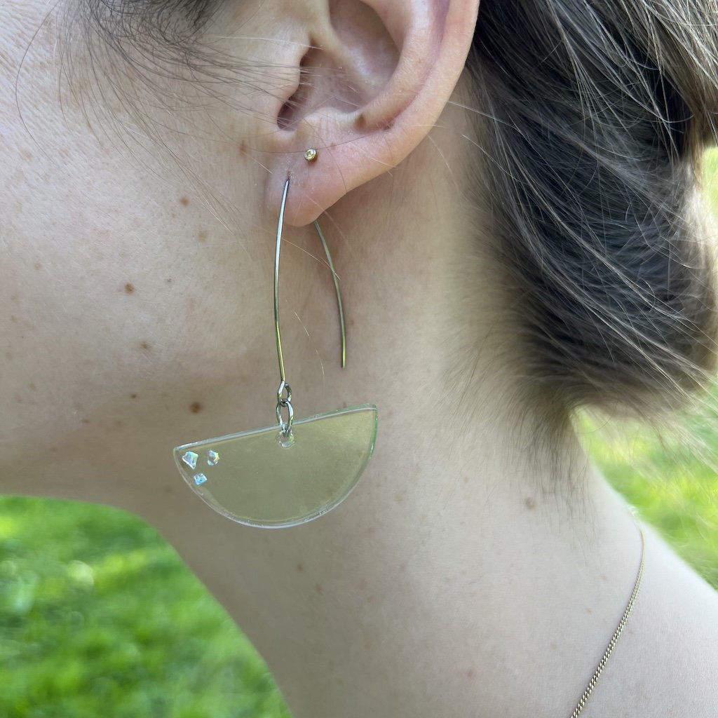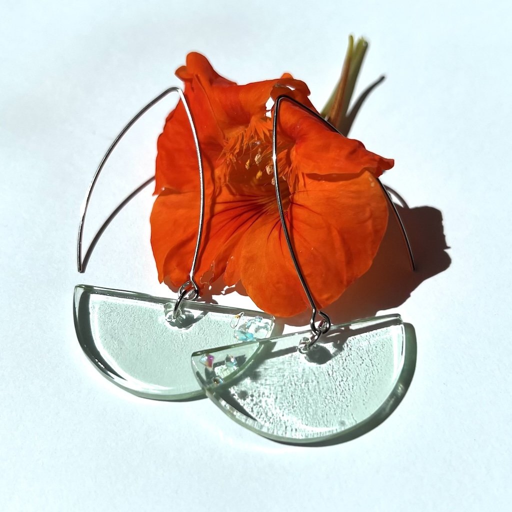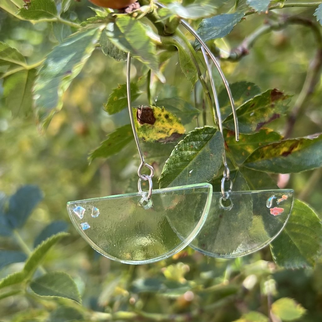 Elegantní náušnice zelenkavé barvy, které rozzáří váš den. Jsou vyrobeny ze skla od láhve britského ginu Plymouth a ozdobeny jsou kousky dichroického skla, které je blyštivé a hází hezké odlesky.