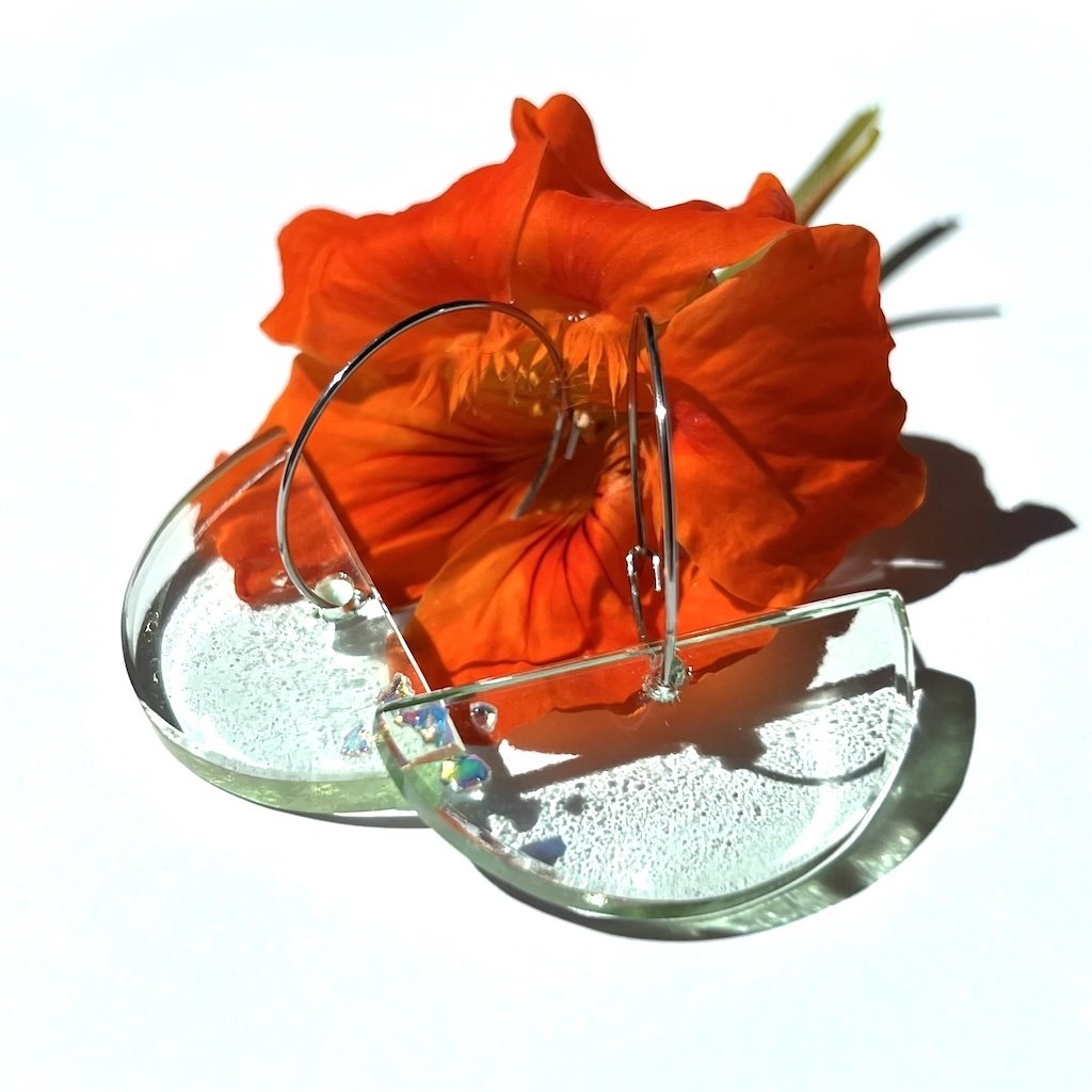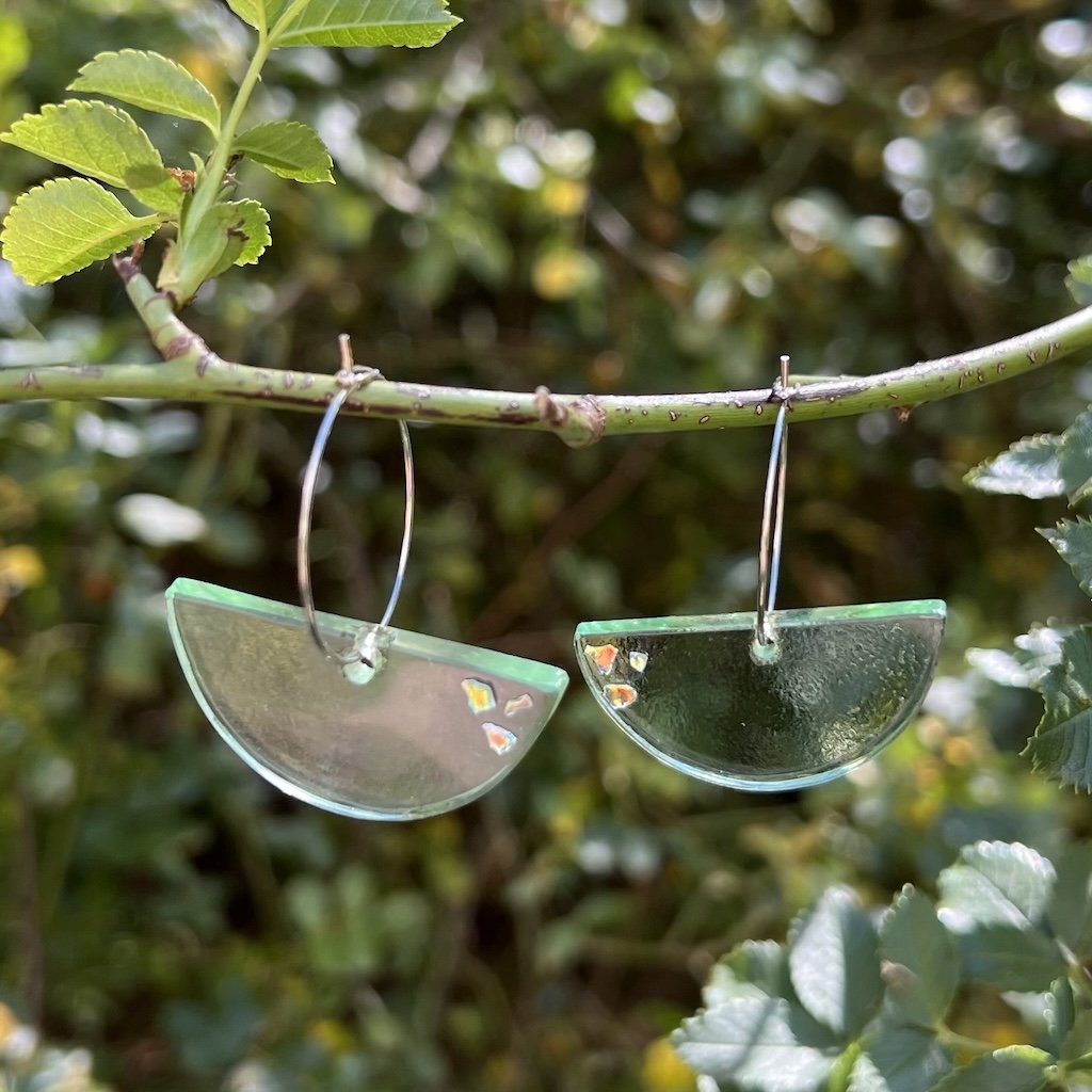 Elegantní zelenkavé náušnice, které rozzáří váš den. Jsou vyrobeny ze skla od láhve britského ginu Plymouth a ozdobeny jsou kousky dichroického skla, které je blyštivé a hází hezké odlesky.