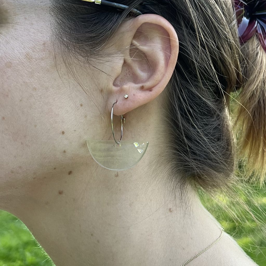 Upcyklované náušnice jsem vyřezala a obrousila ve své dílně v Praze.