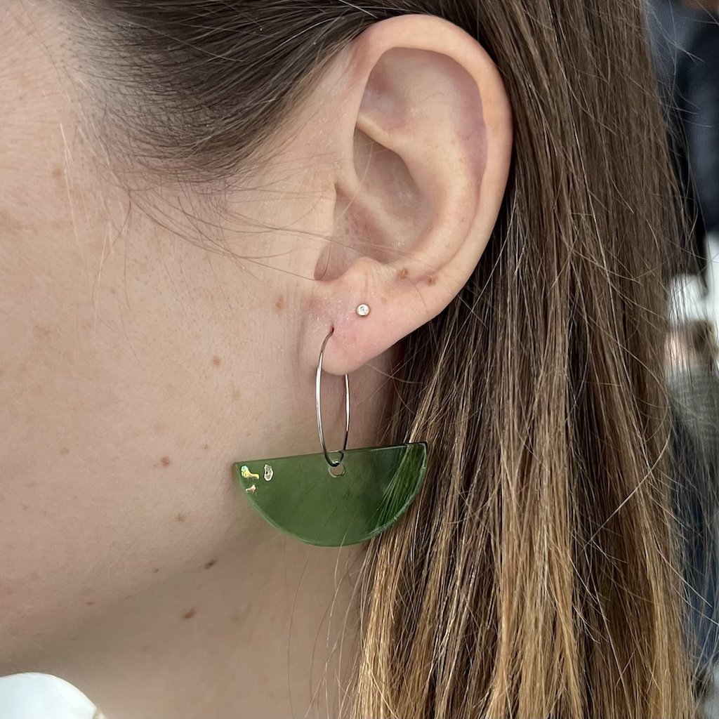 Upcyklované náušnice jsem vyřezala a obrousila ve své dílně v Praze.