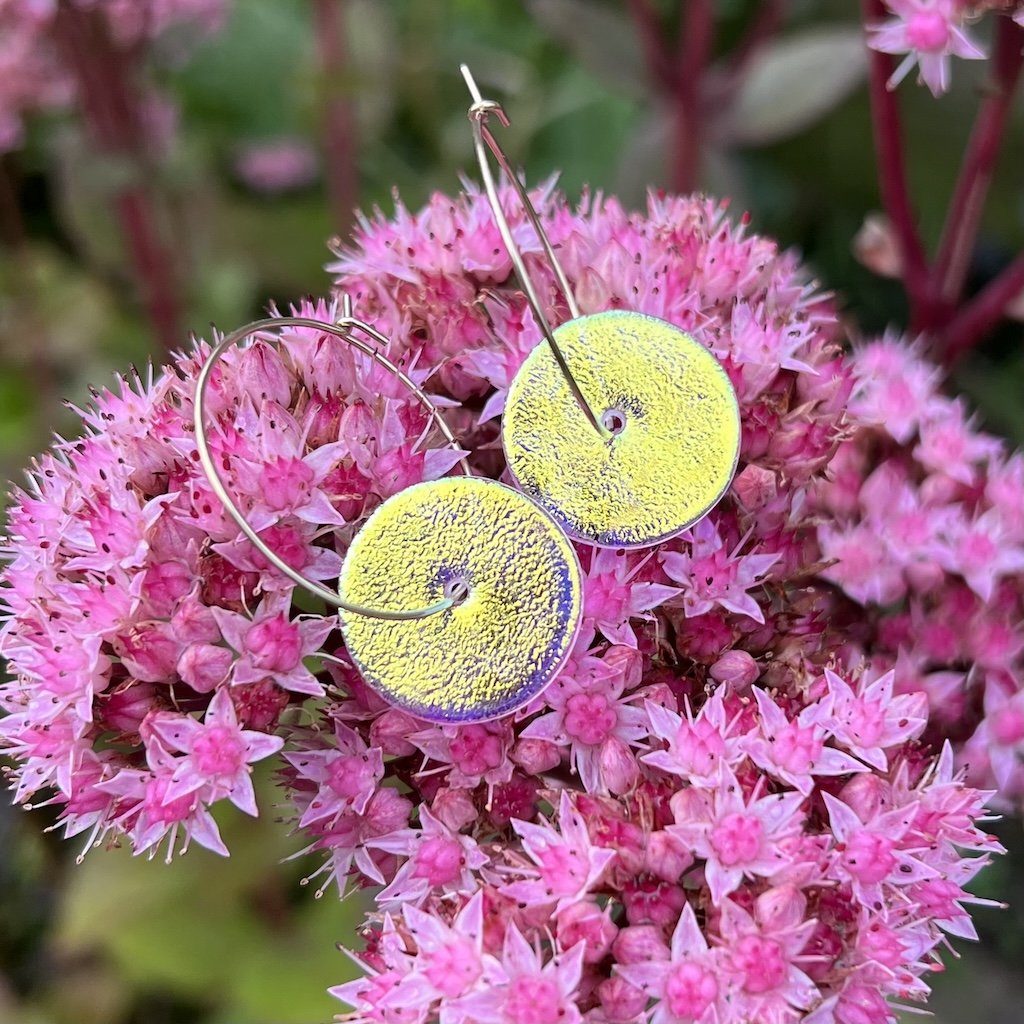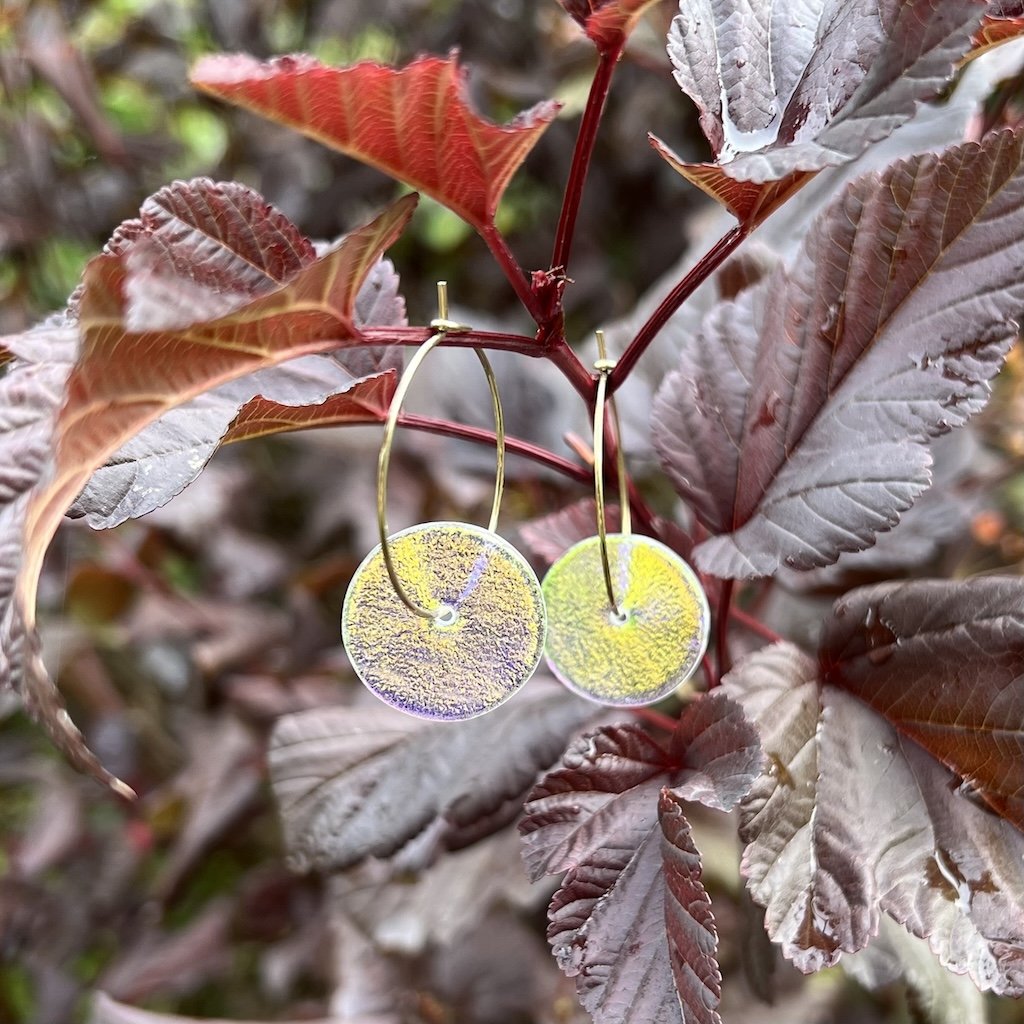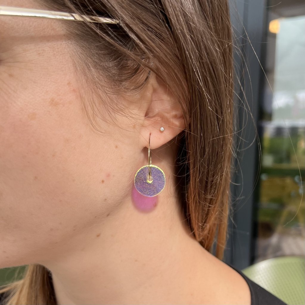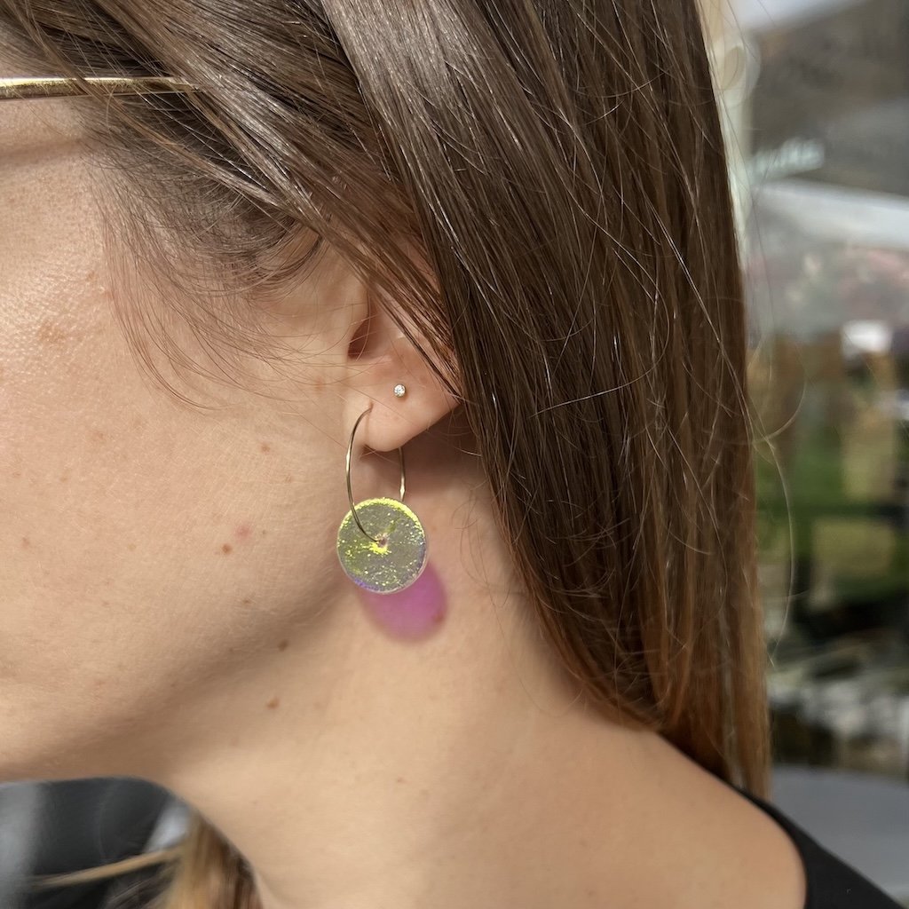 Neotřelé náušnice jsou vyrobeny z tzv. dichroického skla, které je velmi blyštivé. Jeho jedinečností je také to, že mění barvu v závislosti na úhlu pohledu a zdroji světla. Tento jedinečný efekt mu dodává luxusní a futuristický vzhled. Tyto náušnice jsou mají odstíny zlaté s přechody do fialové až růžové.