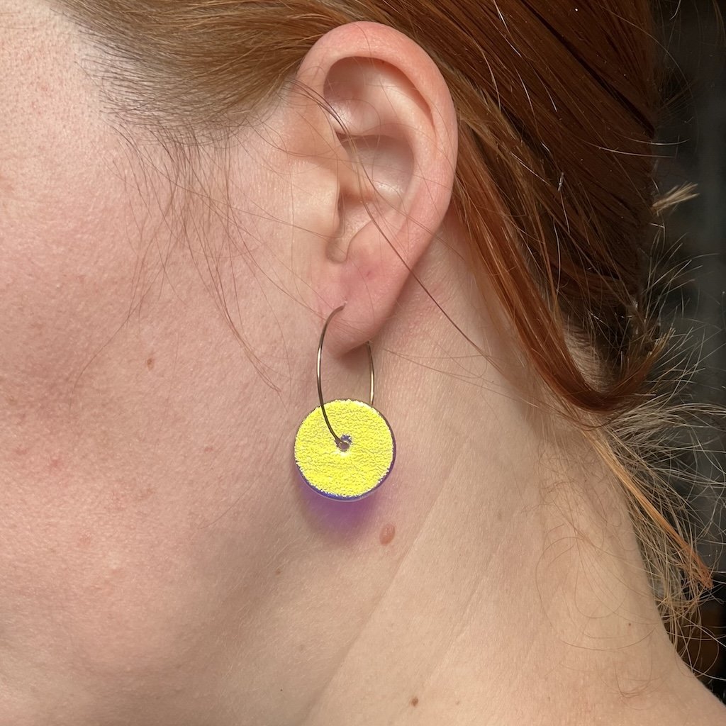 Tvar kolečka je zavěšen na kroužku z chirurgické oceli. Tento typ zapínaní je super praktický, zvláště v zimním počasí, kdy nosíme šály, jelikož vám drží krásně na svém místě a nehrozí ztracení náušnice.