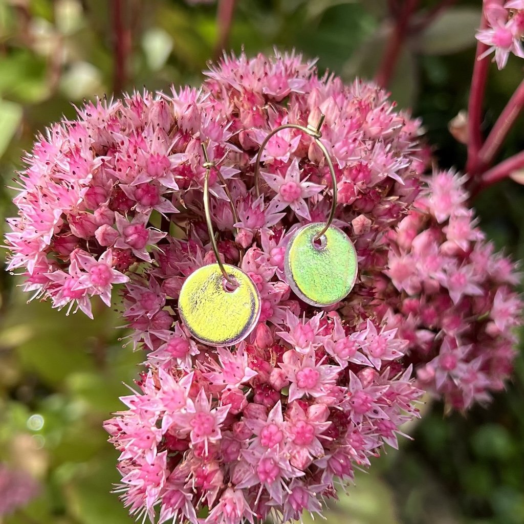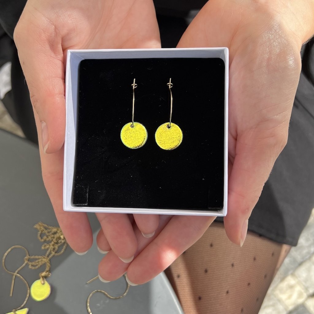 Tvar kolečka je zavěšen na kroužku z chirurgické oceli. Tento typ zapínaní je super praktický, zvláště v zimním počasí, kdy nosíme šály, jelikož vám drží krásně na svém místě a nehrozí ztracení náušnice.