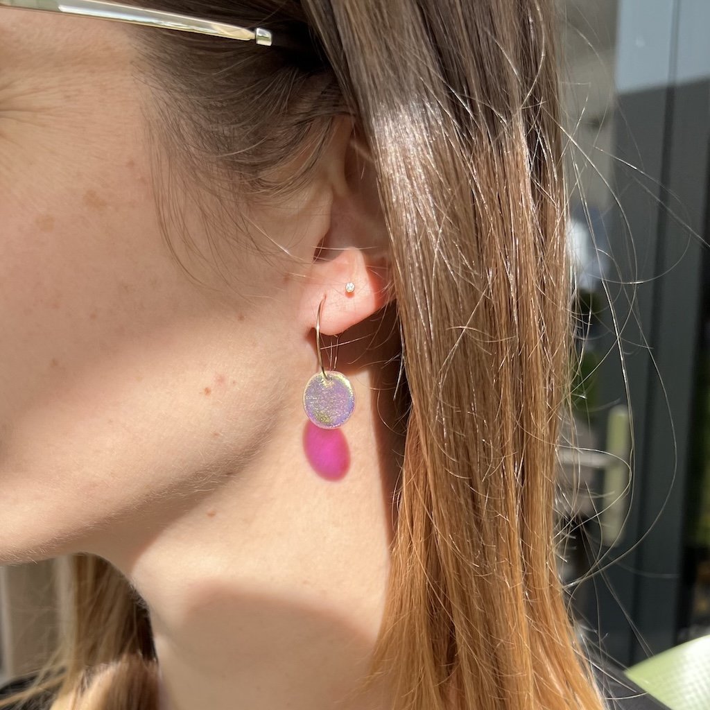 Elegantní menší náušnice jsou vyrobeny z tzv. dichroického skla, které je velmi blyštivé. Jeho jedinečností je také to, že mění barvu v závislosti na úhlu pohledu a zdroji světla. Tento jedinečný efekt mu dodává luxusní a futuristický vzhled. Tyto náušnice jsou mají odstíny zlaté s přechody do fialové až růžové.