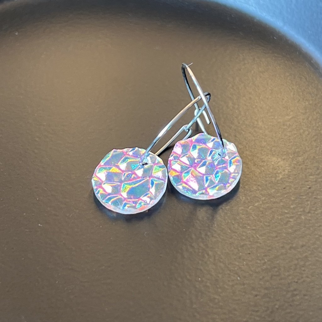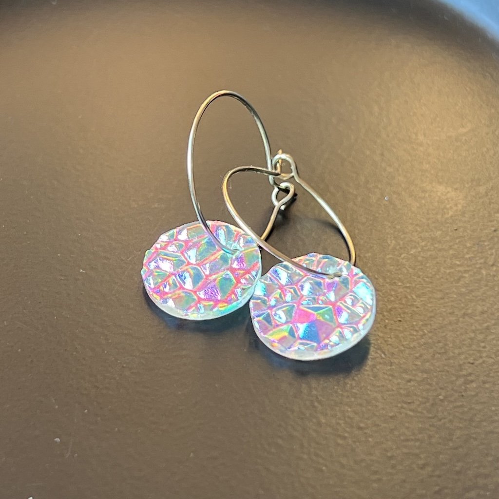 Elegantní menší náušnice jsou vyrobeny z tzv. dichroického skla, které je velmi blyštivé. Jeho jedinečností je také to, že mění barvu v závislosti na úhlu pohledu a zdroji světla. Tento jedinečný efekt mu dodává luxusní a futuristický vzhled. Tyto náušnice jsou mají odstíny všech barev.