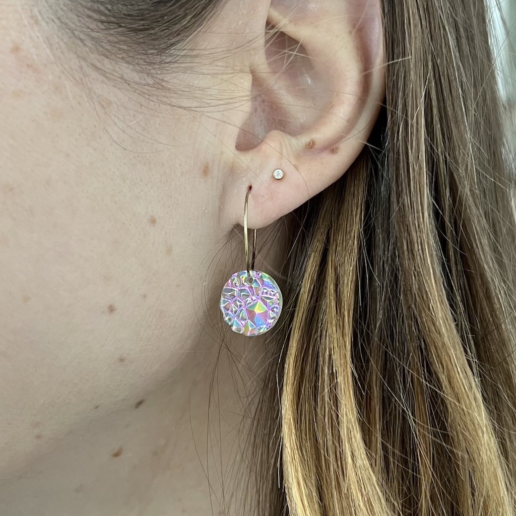 Tvar kolečka je zavěšen na kroužku z chirurgické oceli. Tento typ zapínaní je super praktický, zvláště v zimním počasí, kdy nosíme šály, jelikož vám drží krásně na svém místě a nehrozí ztracení náušnice.