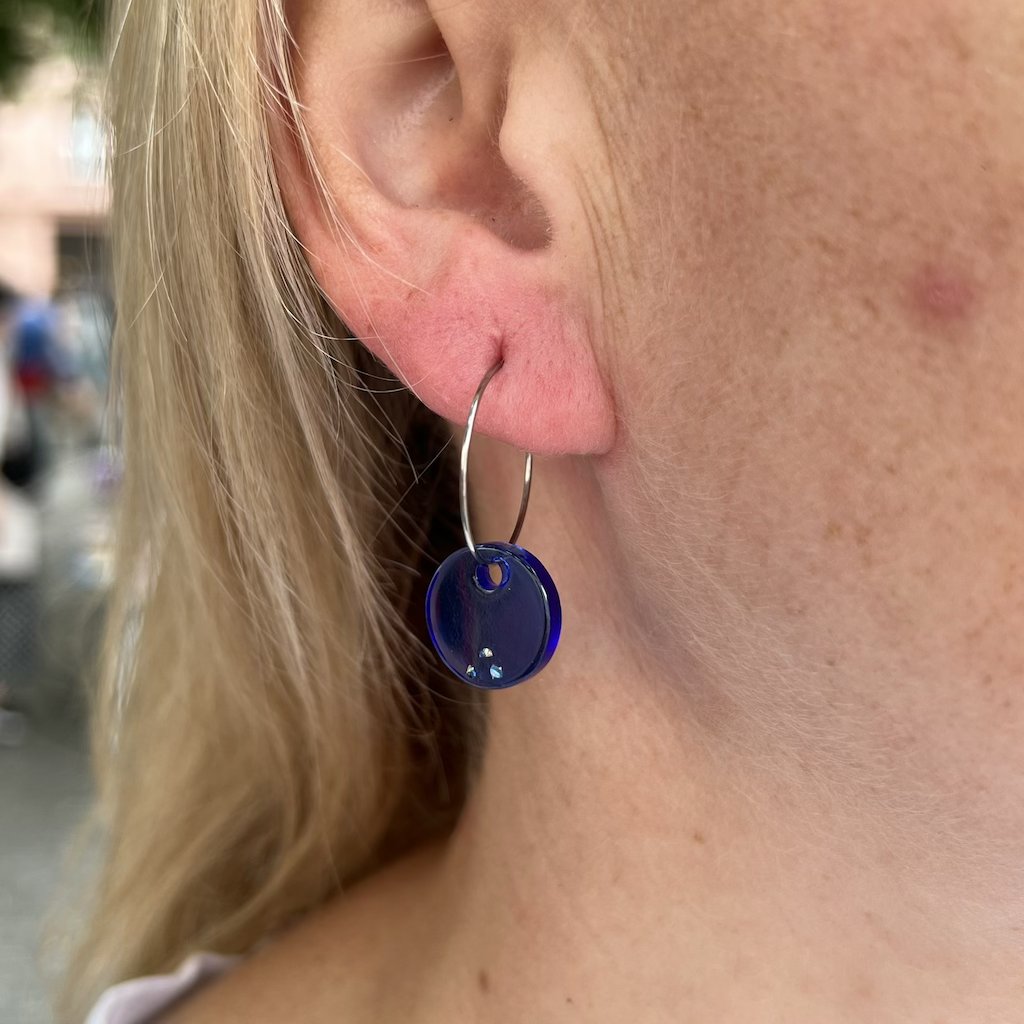 Recyklované náušnice jsem vyřezala a obrousila ve své dílně v Praze. Tvar kolečka je zavěšen na kroužku z chirurgické oceli. Tento typ zapínaní je super praktický, zvláště v zimním počasí, kdy nosíme šály, jelikož vám drží krásně na svém místě a nehrozí ztracení náušnice.