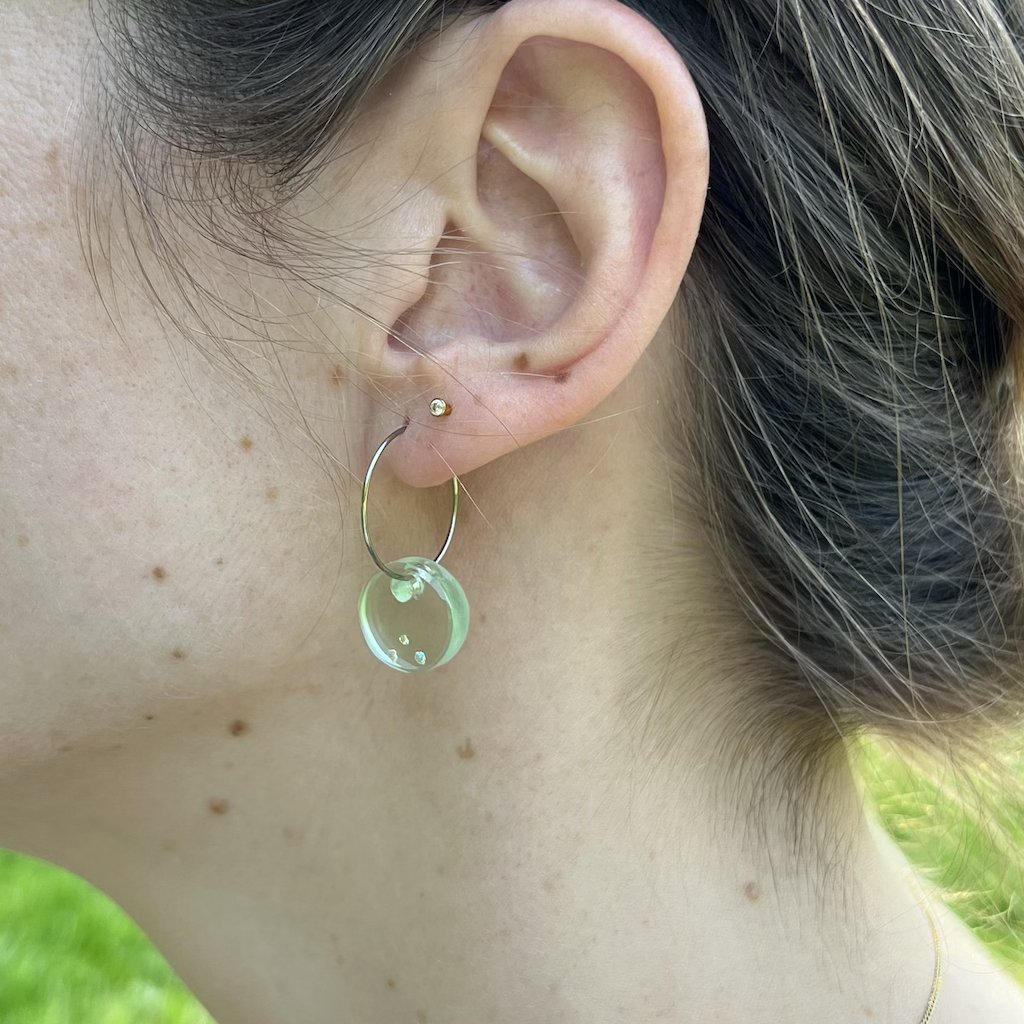 Tvar kolečka je zavěšen na kroužku z chirurgické oceli. Tento typ zapínaní je super praktický, zvláště v zimním počasí, kdy nosíme šály, jelikož vám drží krásně na svém místě a nehrozí ztracení náušnice.
