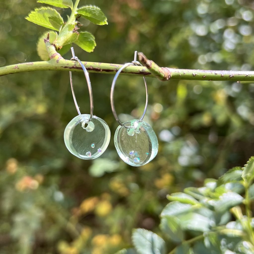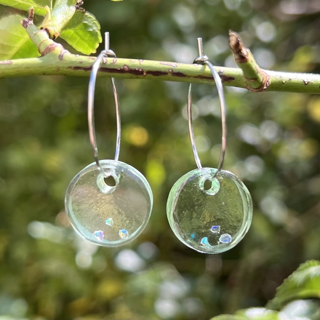 Elegantní menší náušnice zelenkavé barvy jsou vyrobeny ze skla láhve britského ginu Plymouth a ozdobeny jsou dichroickým sklem, které hází krásné odlesky.