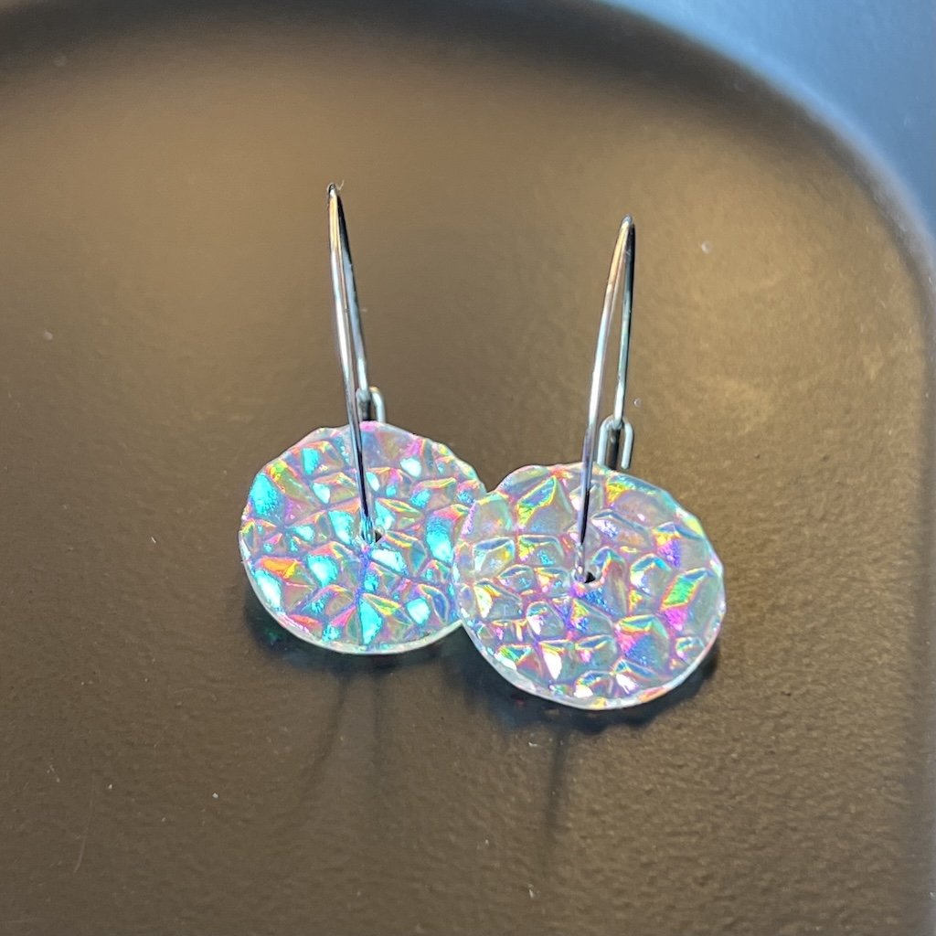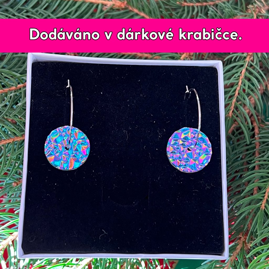 Neotřelé náušnice jsou vyrobeny z tzv. dichroického skla, které je velmi blyštivé. Jeho jedinečností je také to, že mění barvu v závislosti na úhlu pohledu a zdroji světla. Tento jedinečný efekt mu dodává luxusní a futuristický vzhled. Tyto náušnice jsou mají odstíny všech barev.