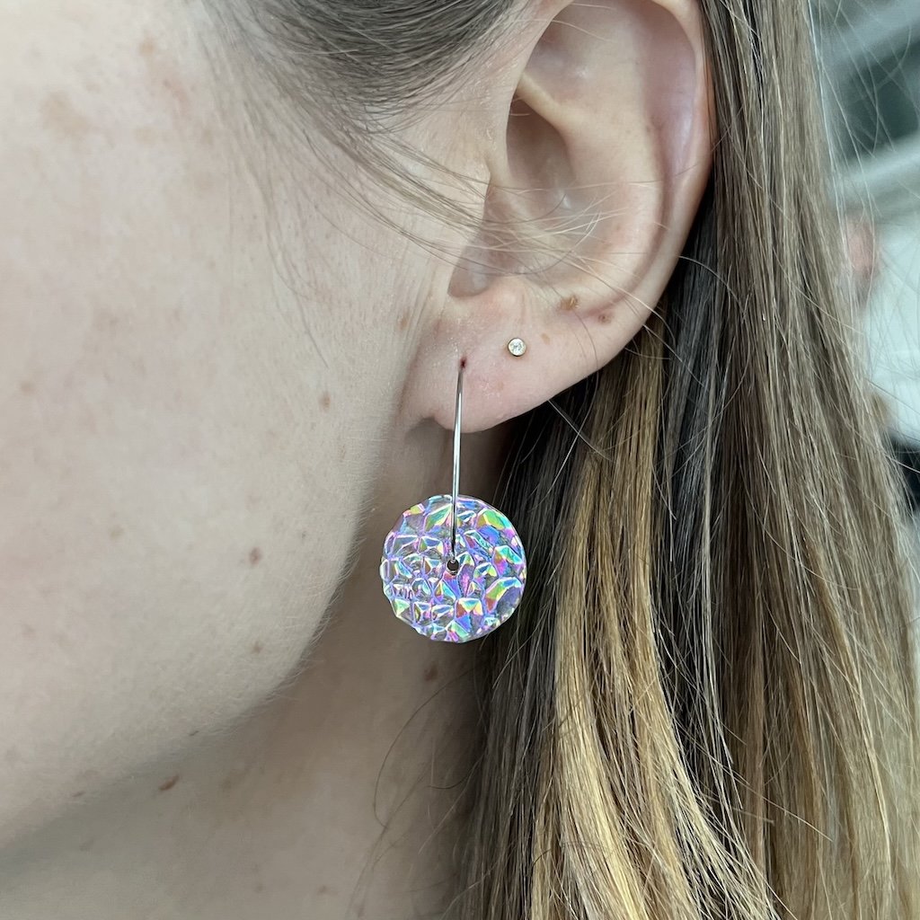 Tvar kolečka je zavěšen na kroužku z chirurgické oceli. Tento typ zapínaní je super praktický, zvláště v zimním počasí, kdy nosíme šály, jelikož vám drží krásně na svém místě a nehrozí ztracení náušnice.