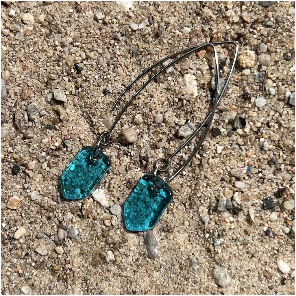 Elegantní náušnice, které rozzáří váš den. Jsou vyrobeny ze skla tyrkysové barvy, která dodá vašemu outfitu tu správnou letní náladu.