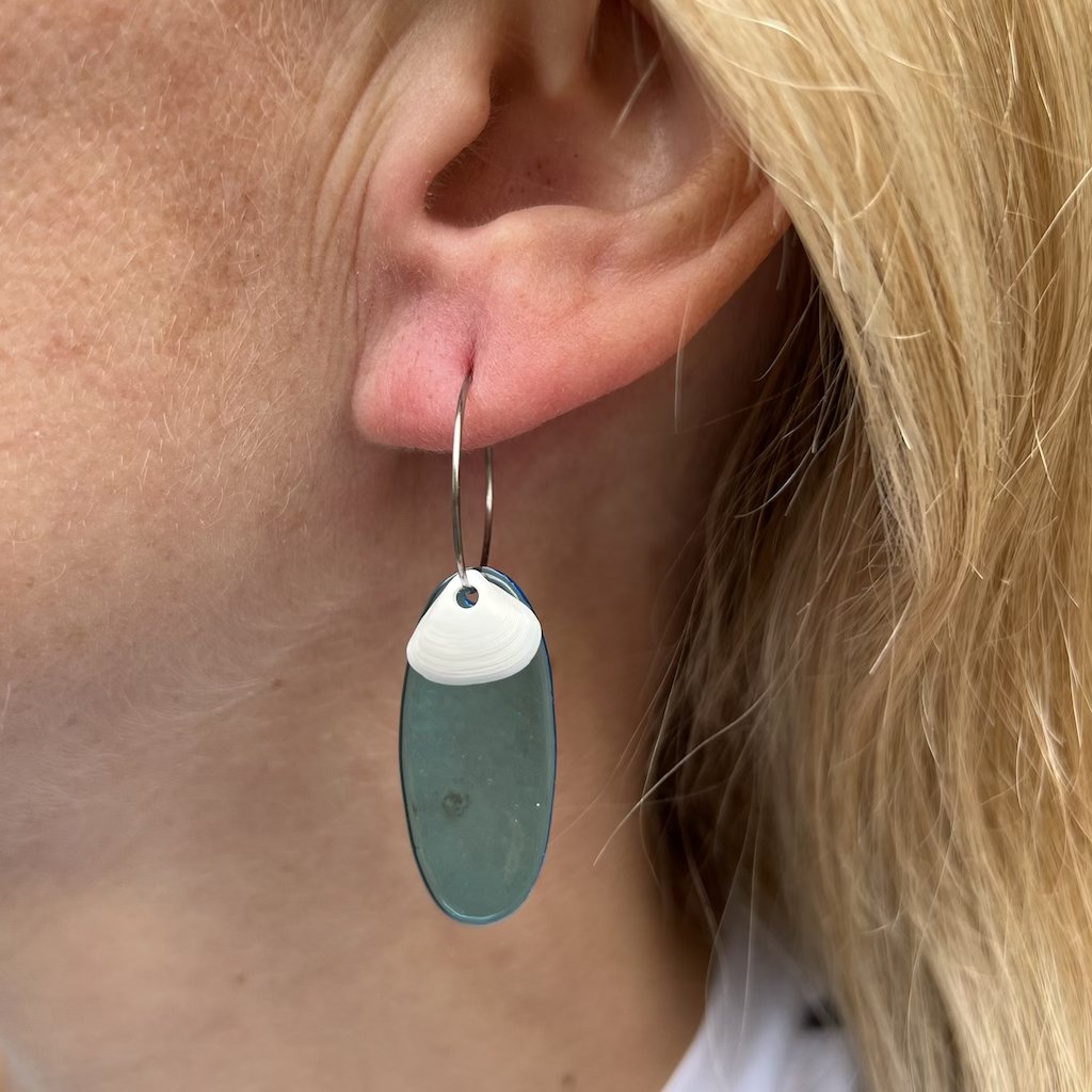 Tvar oválu s mušličkou je zavěšen na kroužku z chirurgické oceli. Tento typ zapínaní je super praktický, zvláště v zimním počasí, kdy nosíme šály, jelikož vám drží krásně na svém místě a nehrozí ztracení náušnice.