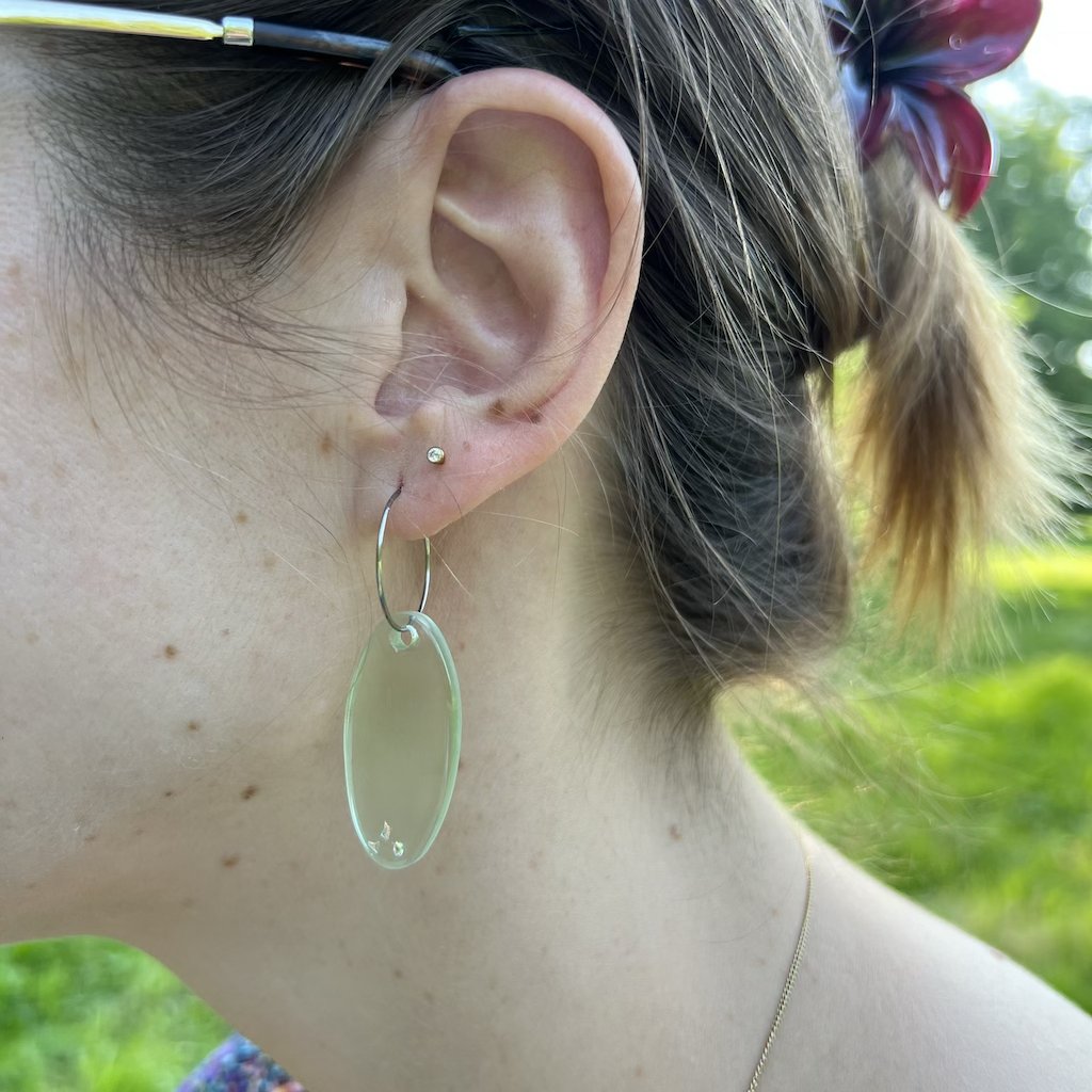Tvar oválu je zavěšen na kroužku z chirurgické oceli. Tento typ zapínaní je super praktický, zvláště v zimním počasí, kdy nosíme šály, jelikož vám drží krásně na svém místě a nehrozí ztracení náušnice.