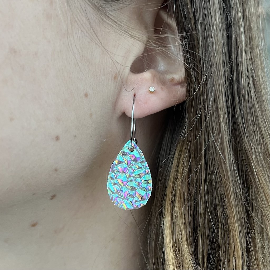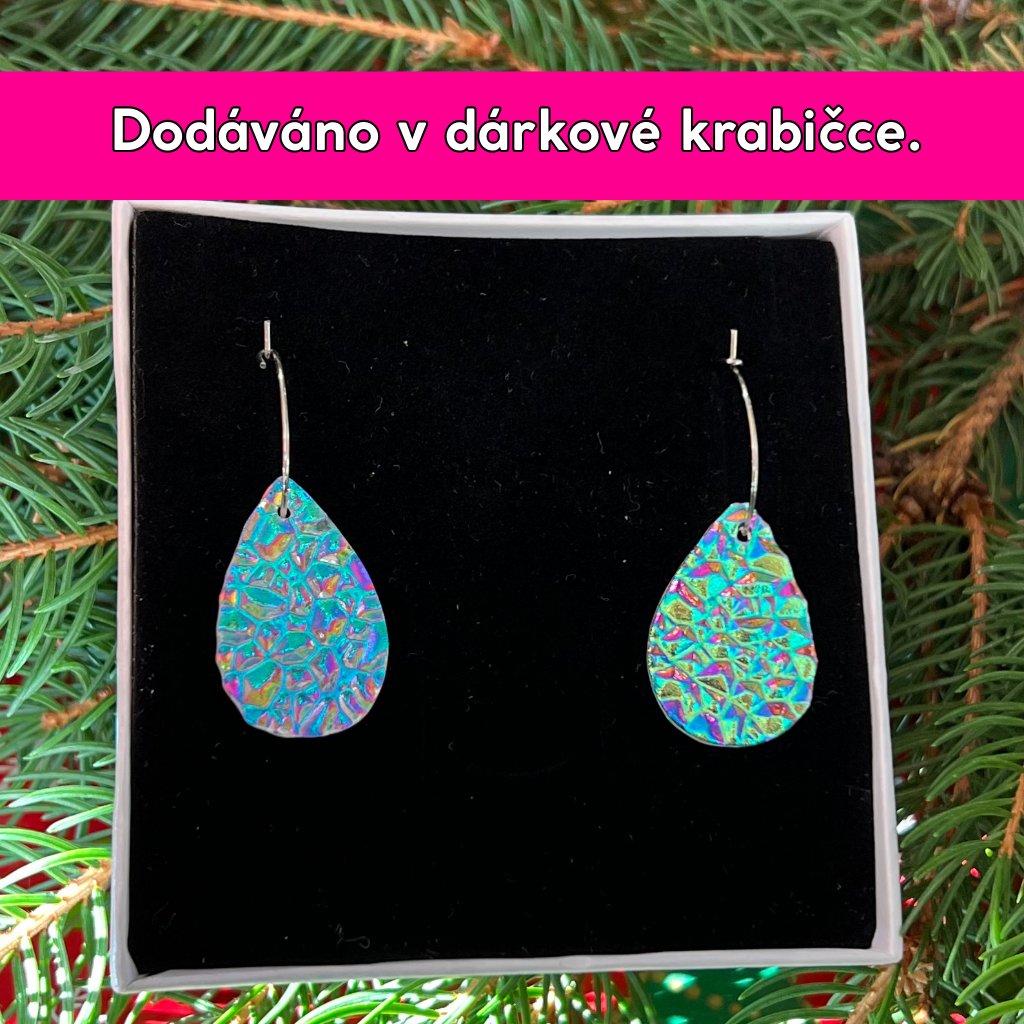 Tvar kapky je zavěšen na kroužku z chirurgické oceli. Tento typ zapínaní je super praktický, zvláště v zimním počasí, kdy nosíme šály, jelikož vám drží krásně na svém místě a nehrozí ztracení náušnice.
