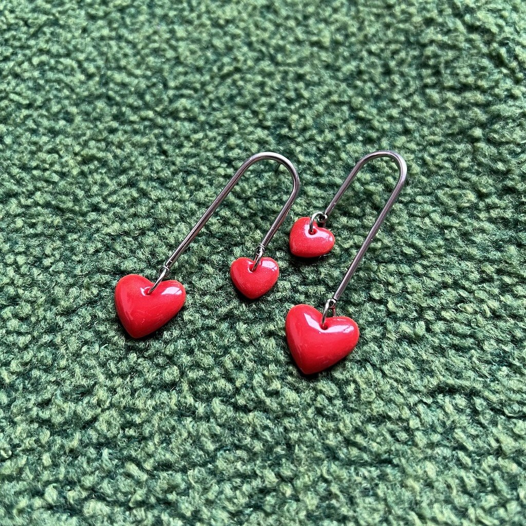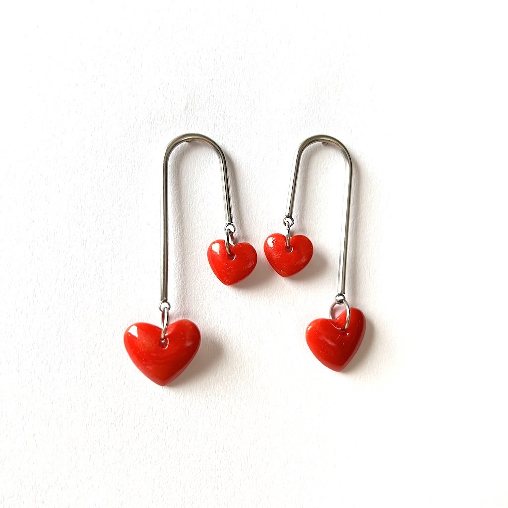 Tyto ručně vyráběné visací skleněné náušnice se dvěma srdíčky vznikají z rozdrceného skla, jemného skleněného prachu, který se znovu rodí v peci. Dvě skleněná srdíčka zavěšená na háčku vytvářejí hravý pohyb a krásnou vizuální dynamiku, která přitahuje pohled. Každý pár je malým důkazem toho, že i z fragmentů může vzniknout něco krásného.