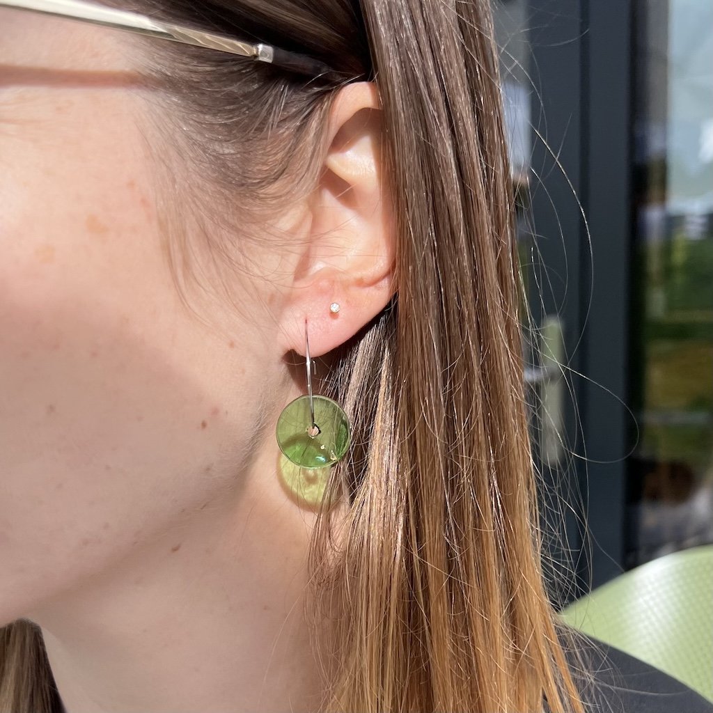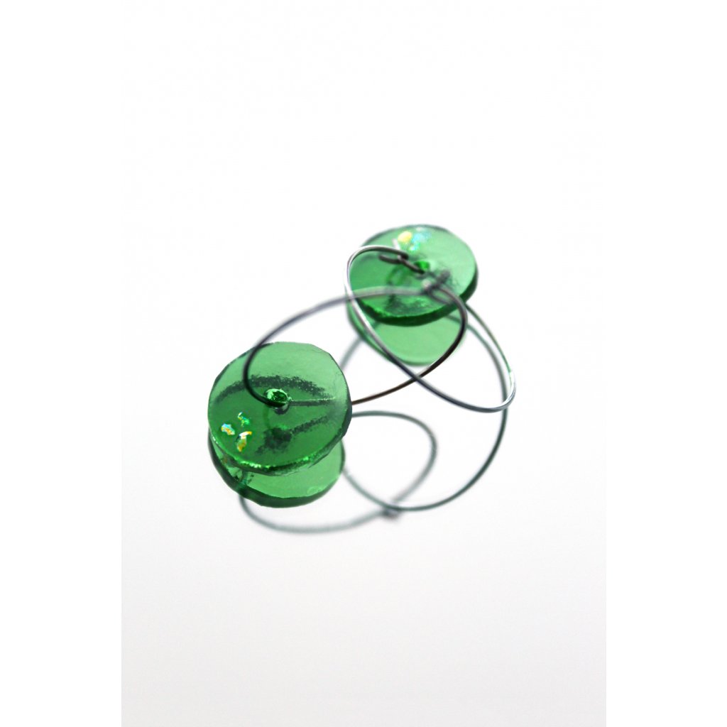 Recyklované náušnice jsem vyřezala a obrousila ve své dílně v Praze. Tvar kolečka je zavěšen na kroužku z chirurgické oceli. Tento typ zapínaní je super praktický, zvláště v zimním počasí, kdy nosíme šály, jelikož vám drží krásně na svém místě a nehrozí ztracení náušnice.