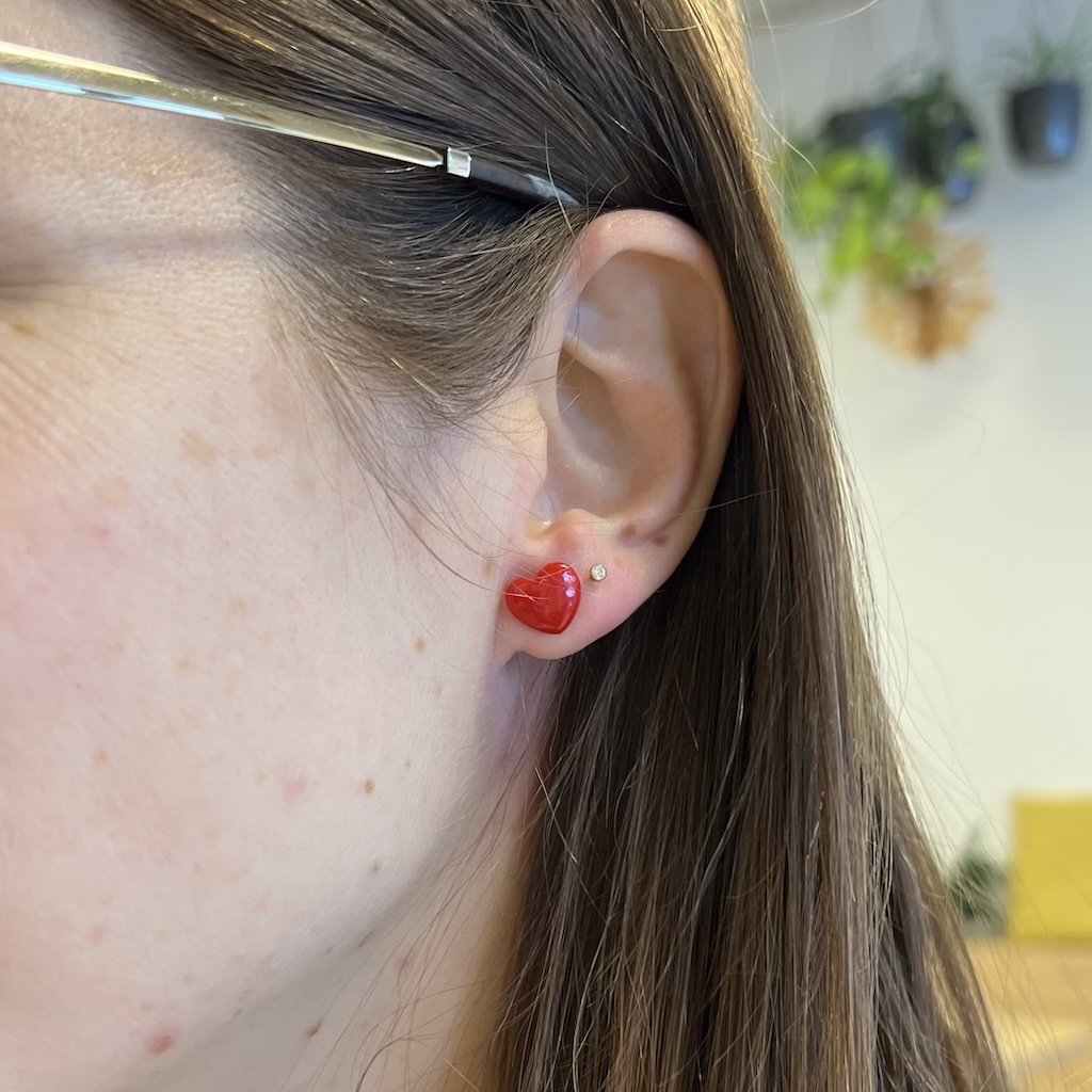 Tyto ručně vyráběné skleněné náušnice ve tvaru srdce vznikají z rozdrceného skla, jemného skleněného prachu, který se znovu rodí v peci. Každý pár je malým důkazem toho, že i z fragmentů může vzniknout něco krásného.